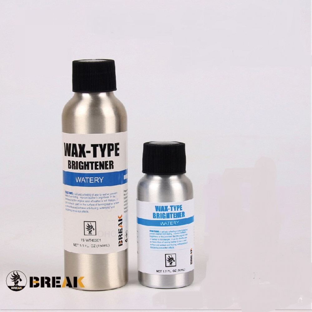 WAX-TYPE BRIGHTENER - восковой финиш, своеобразный "жидкий воск". После нанесения финиша получаем эффект как после нанесения карнаубского воска, хорошо распределенного по коже феном, но, в отличие от карнаубы, данный финиш не требует ни нагрева, ни усилий при располировке. Наносится как финиш, легко полируется тканью, не меняет исходного цвета кожи. После высыхания и полировки поверхность на ощупь гладкая, приятная. Кожа с мереёй, естественным рисунком после этого финиша от BREAK смотрится богаче .