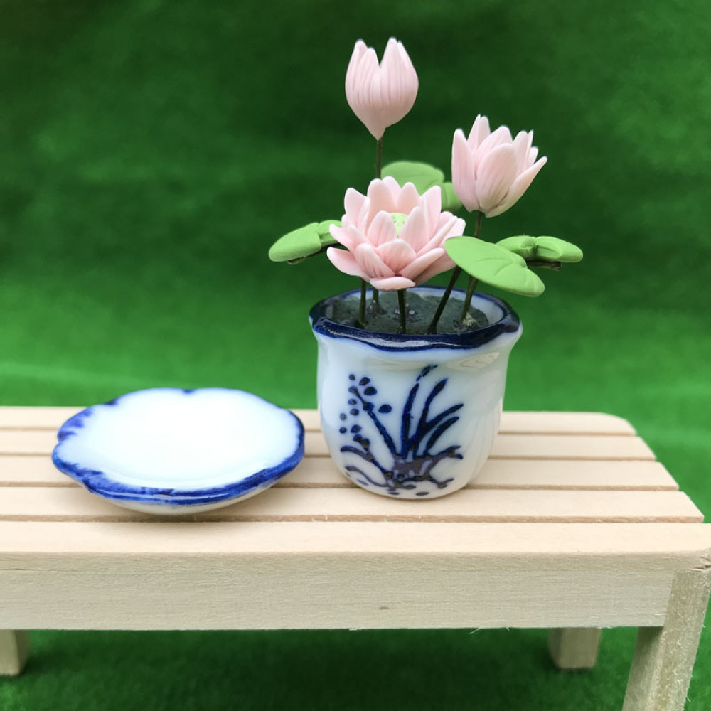 Цветы лотоса в керамическом горшочке с синим узором и керамическим поддоном, прекрасно украсят кукольный домик или миниатюрный сад.
