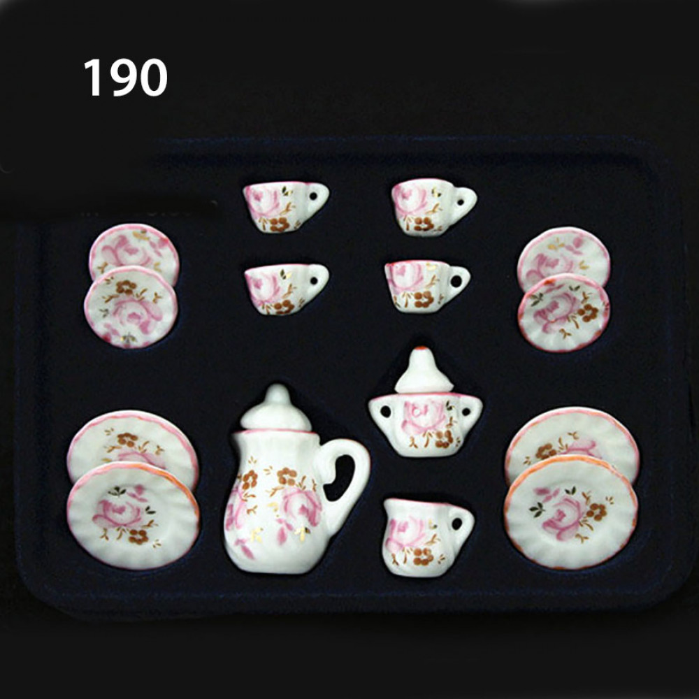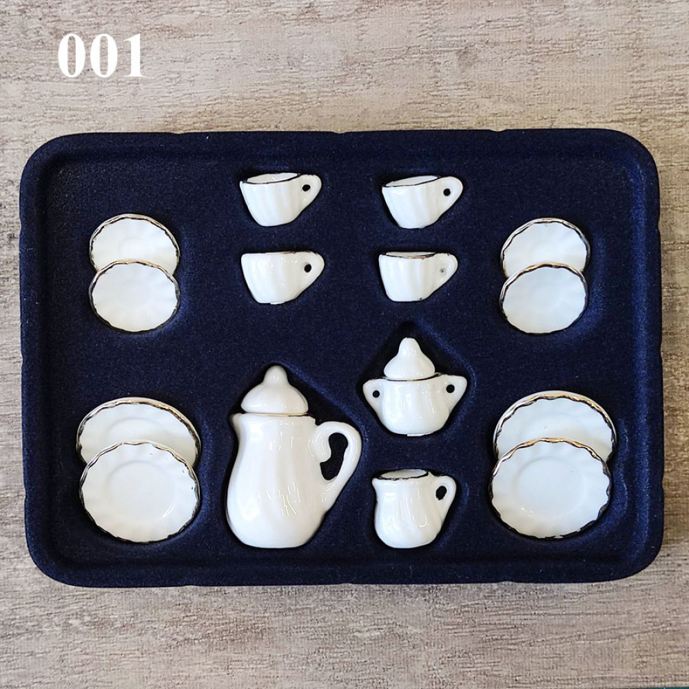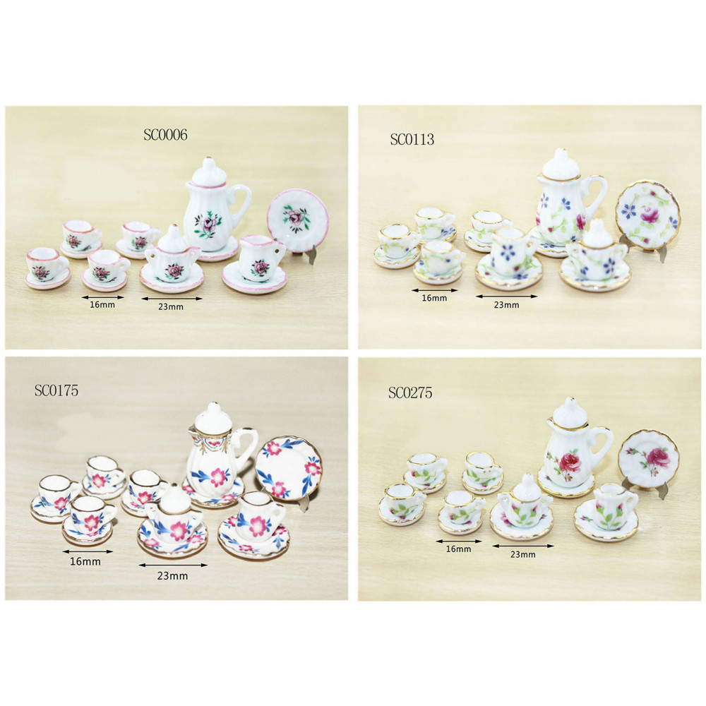 Миниатюрный чайный сервиз для кукол - 15 предметов. На сайте в списке опций можно выбрать большой ассортимент различных орнаментов и расцветок.