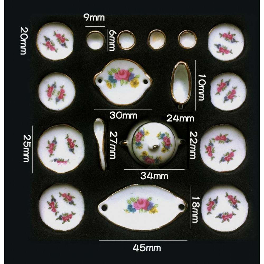 Миниатюрный столовый сервиз для кукол на 4 персоны c цветочным орнаментом (розы и васильки) - для румбоксов и кукольных домиков