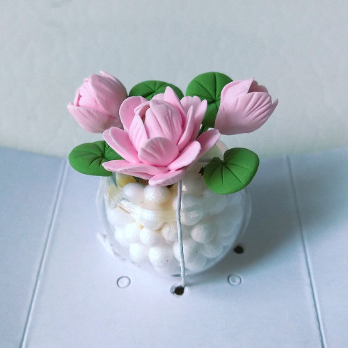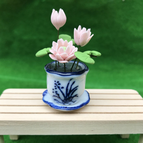 Цветы лотоса в керамическом горшочке с синим узором и керамическим поддоном, прекрасно украсят кукол..