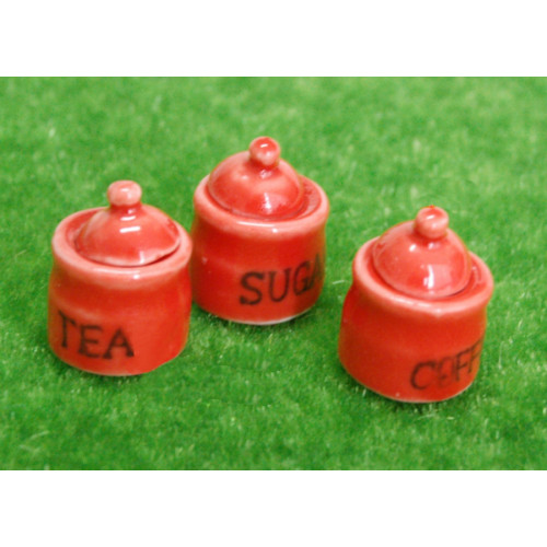 Набор миниатюрных красных керамических баночек для чая, кофе и сахара (надписи на английском языке)...