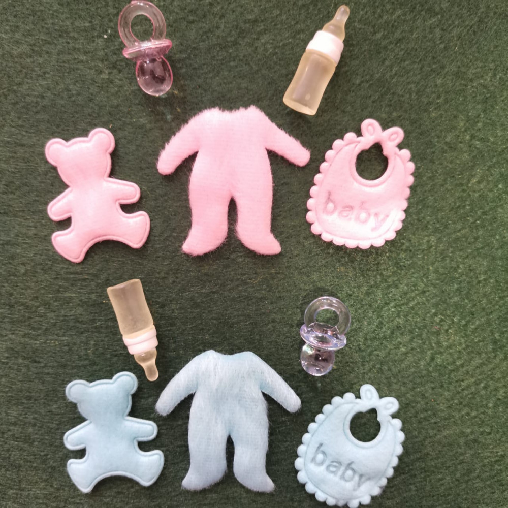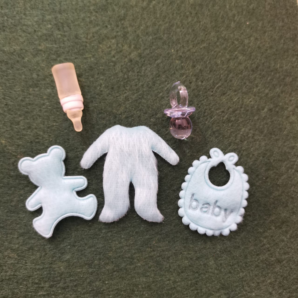 Миниатюрные вещички для кукольных деток. В набор входит слюнявчик, комбинезон, мишка, соска, бутылочка с водой - есть розовый вариант для девочки и голубой для мальчика.