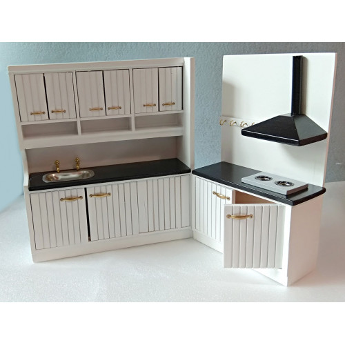Миниатюрный белый кухонный гарнитур для кукол состоит из двух модулей, его можно располагать углом, ..