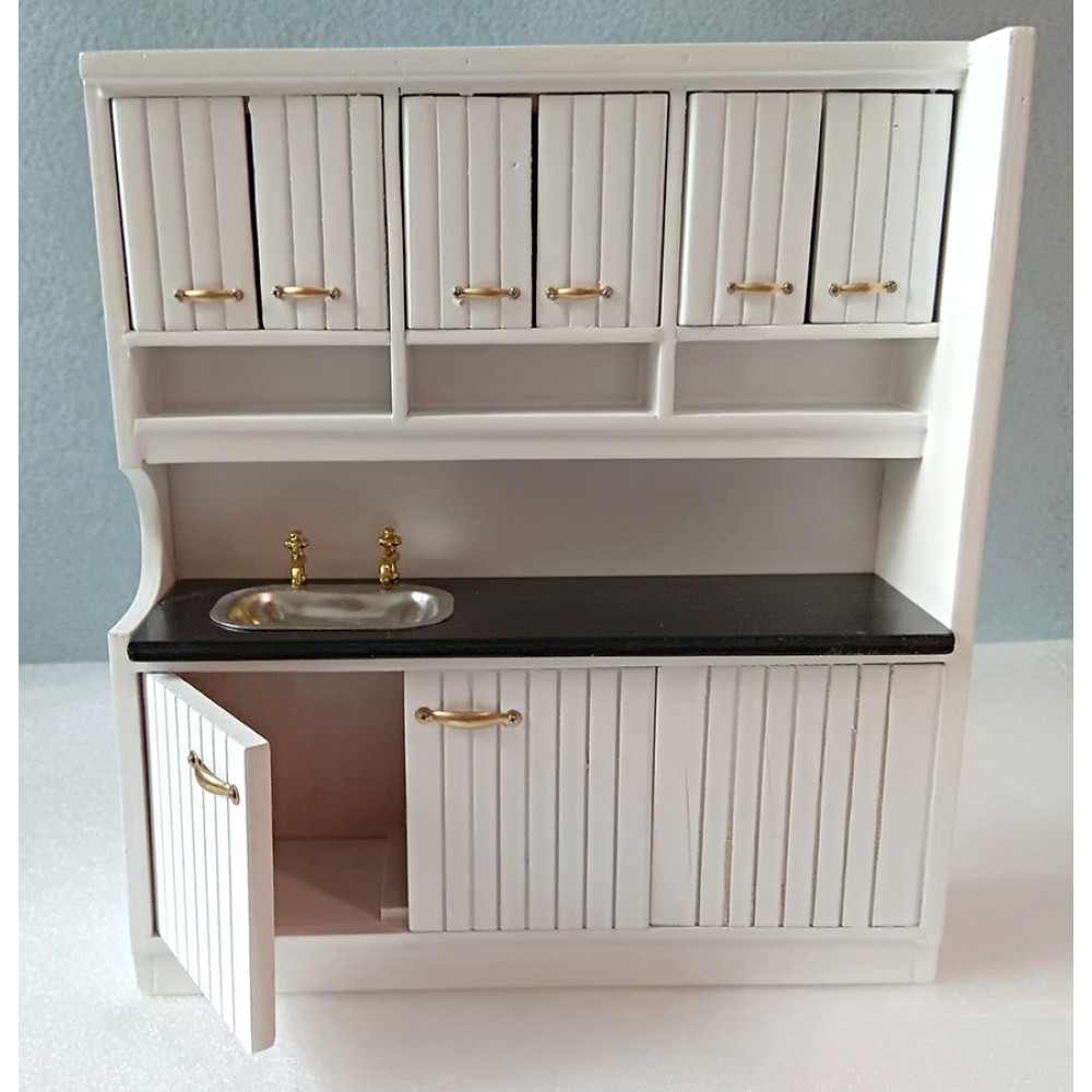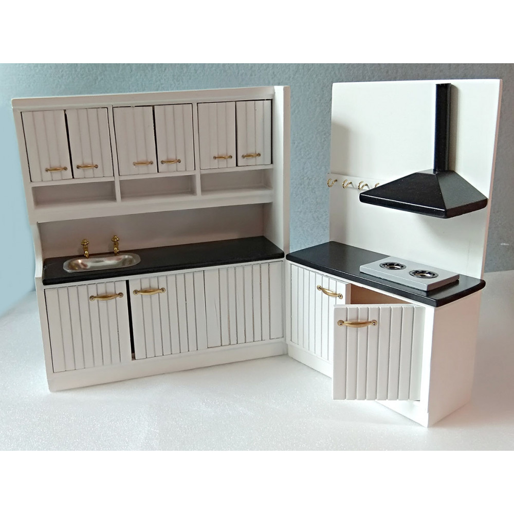 Миниатюрный белый кухонный гарнитур для кукол состоит из двух модулей, его можно располагать углом, а также возможен вариант - по прямой линии или модульно.