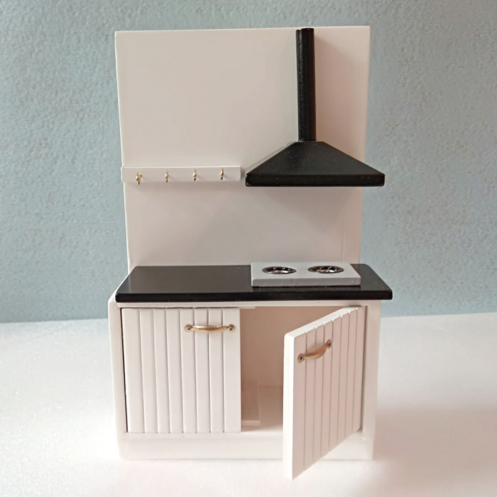 Вместительный кукольный кухонный гарнитур: есть шкафчики внизу и вверху, а также открытые полочки. Рядом с вытяжкой имеется ряд крючков, на которые можно повесить кухонную утварь или полотенце. Такая миниатюрная мебель предназначена для оформления кукольного домика или тематического румбокса в масштабе 1:12.