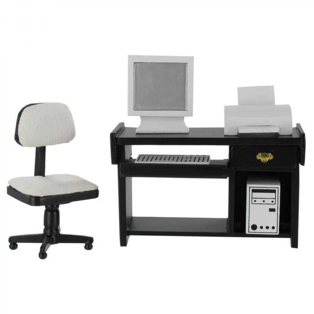 Чтобы оформить кабинет или рабочий уголок в кукольном доме Вам понадобится стол и удобное кресло, а также миниатюрная компьютерная техника. Такой набор мебели и техники подойдет и для организации пространства кукольного офиса.