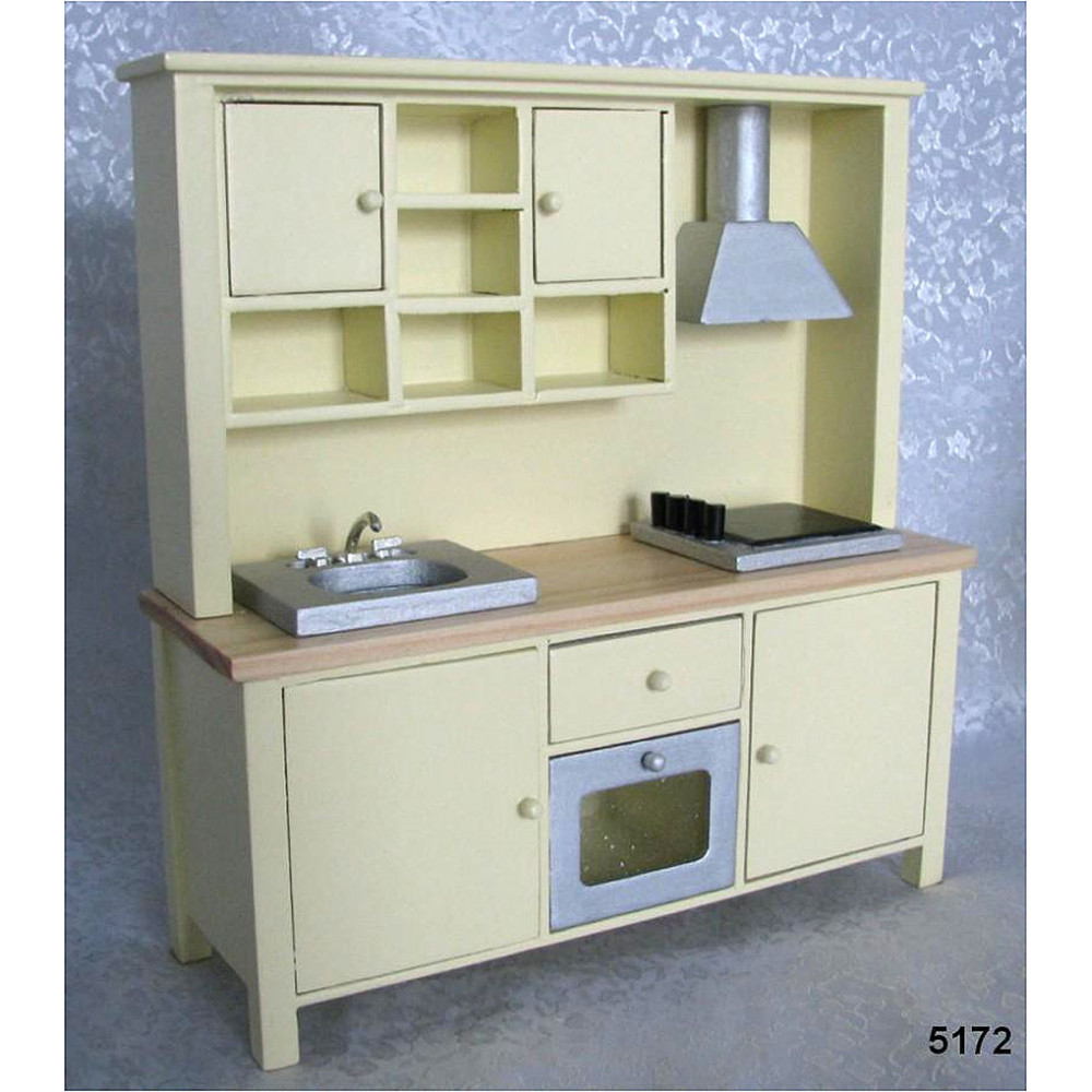 Небольшая компактная кухня для кукол со всем необходимым. Мойка, плита с вытяжкой, духовка, закрытые и открытые шкафчики