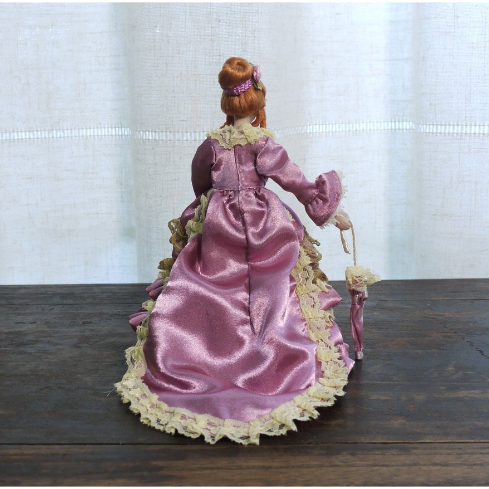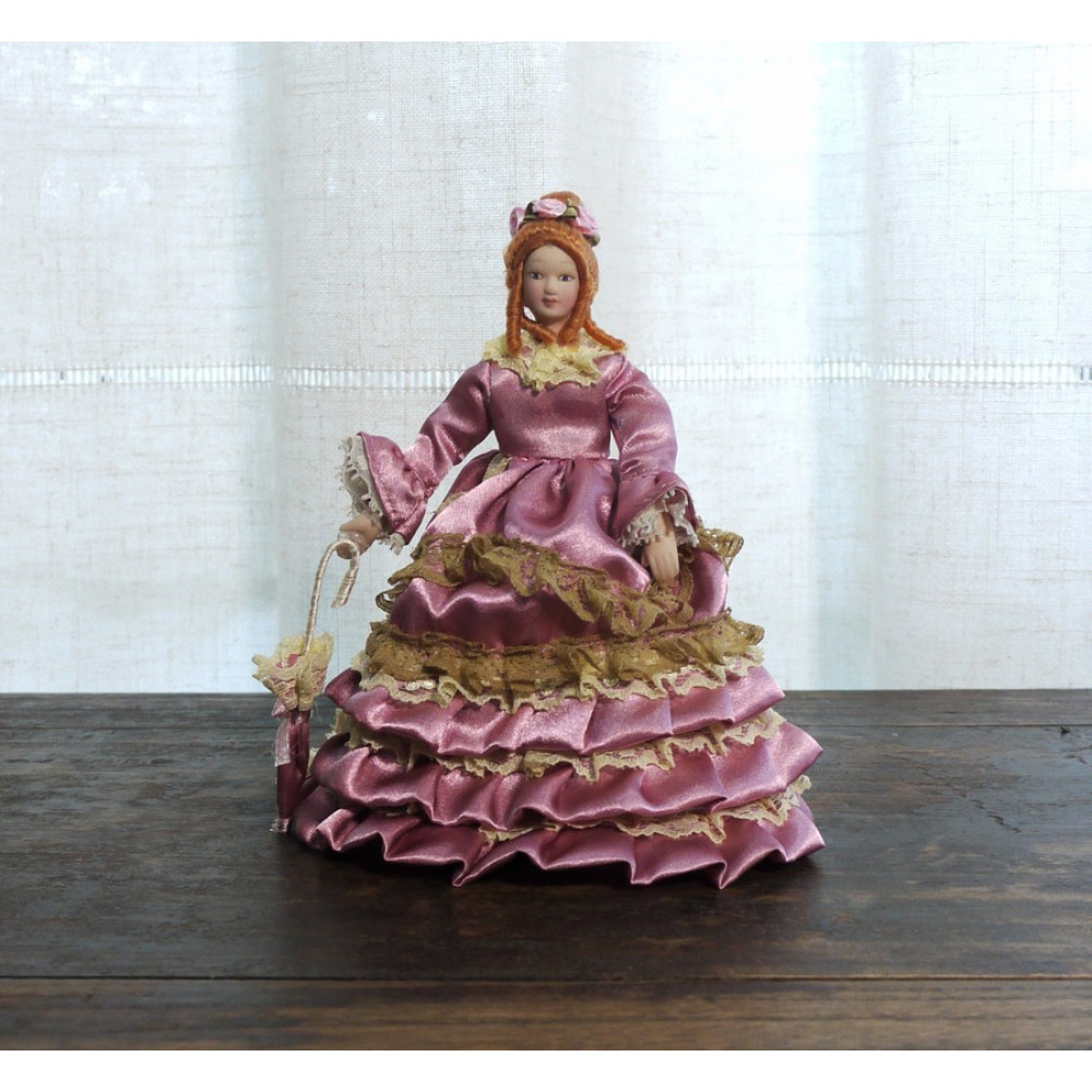 Миниатюрные куколки для домиков и румбоксов в масштабе 1:12. Благородная дама в розовом платье со шлейфом, с кружевной отделкой и рюшами, в руке летний зонтик.