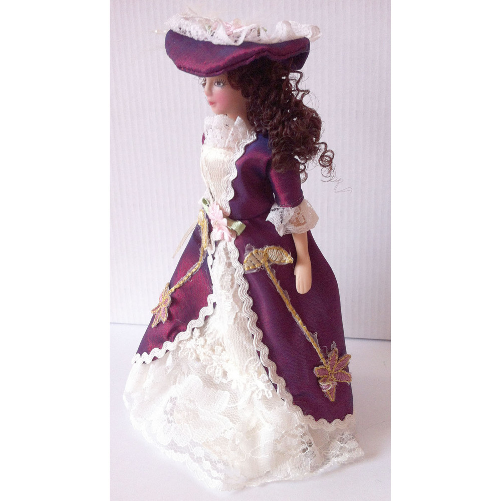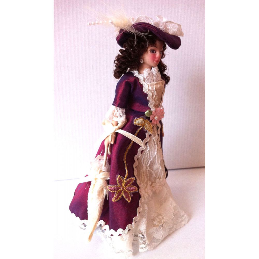 Миниатюрные куколки для домиков и румбоксов в масштабе 1:12. Благородная дама в элегантном бордовом платье с кружевной отделкой и в нарядной шляпе.