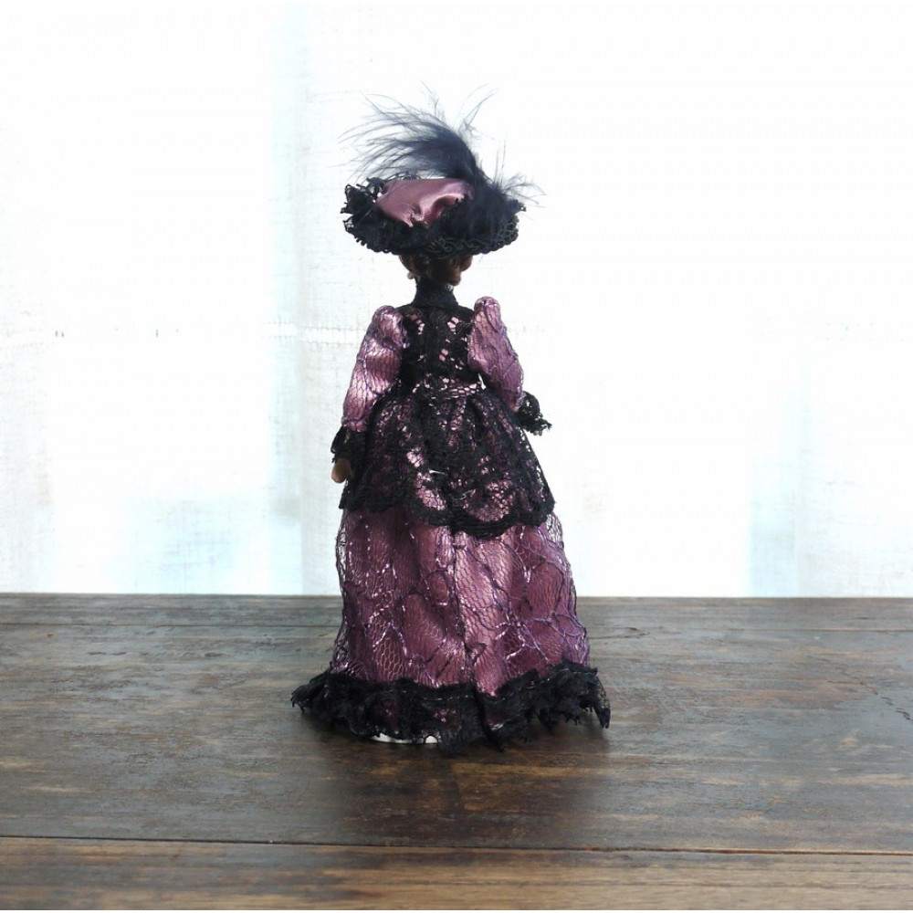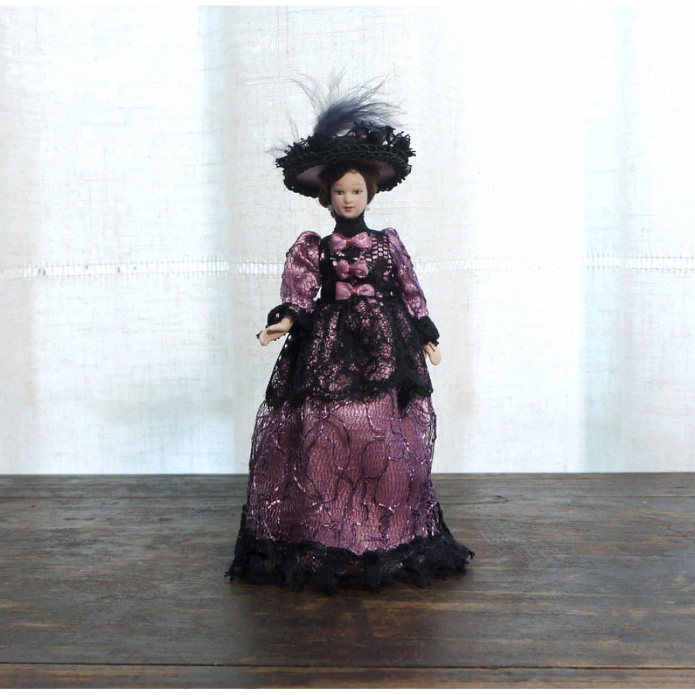 Миниатюрные куколки для домиков и румбоксов в масштабе 1:12. Благородная дама в элегантном лиловом платье с кружевной отделкой и в нарядной шляпе.