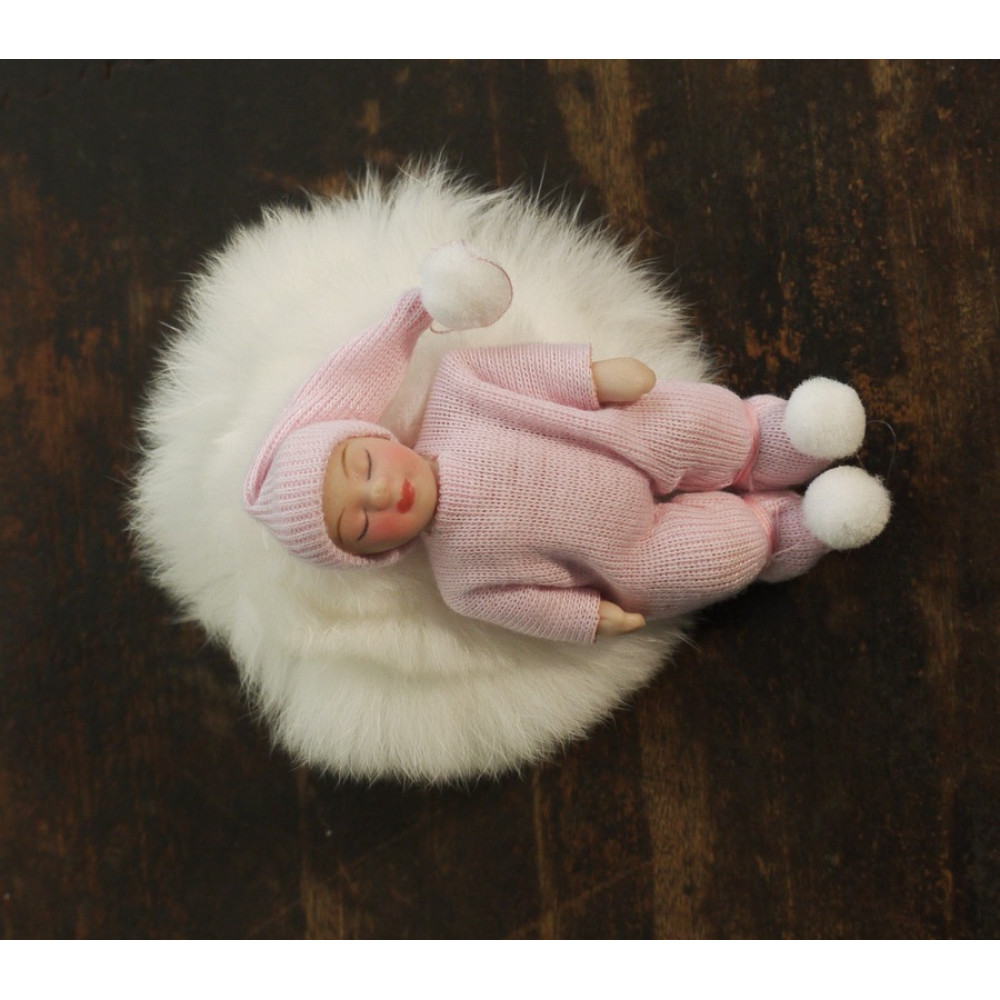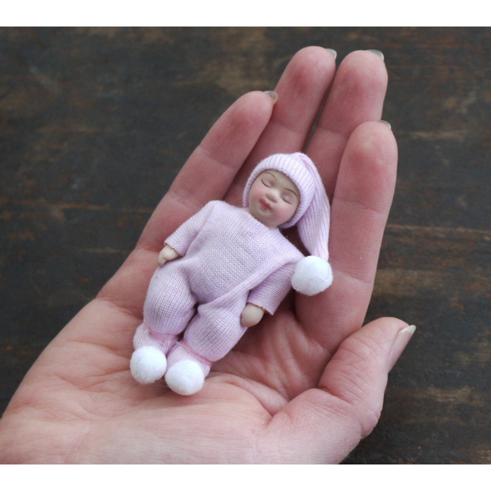 Миниатюрные интерьерные куколки для домиков и румбоксов в масштабе 1:12. Кукла младенец с розовом костюмчике и колпачке.