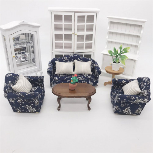 Набор мебели для кукольной гостиной: трехместный диван, кресло с танкеткой и два столикаРазмеры..