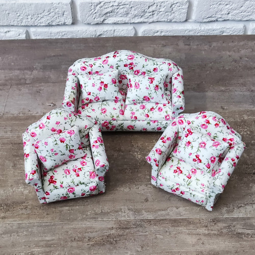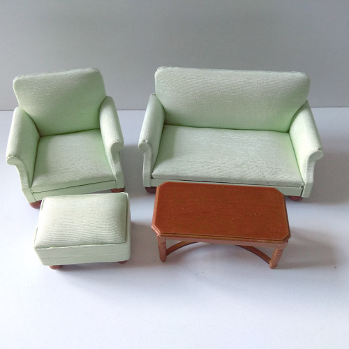 Набор миниатюрной мебели для кукольной гостиной : двухместный диван, просторное кресло, столик и пуф..