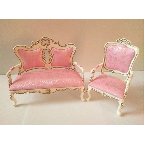 Элегантный диван и кресло для кукольной гостиной с нарядной текстильной обивкой. Мягкая мебель для о..