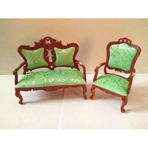 Изящный миниатюрный диванчик с резьбой (двухместный) и 1 кресло для кукольного дома в миниатюре или ..