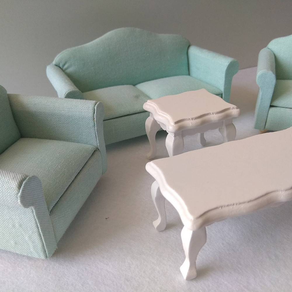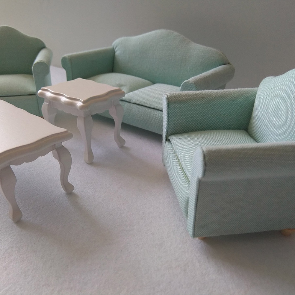 Набор миниатюрной мебели для кукольной гостиной : диван, два кресла и два столика. Такая мебель подойдет для оформления современных интерьеров в кукольных домиках и румбоксов масштабом 1:12 (для куколок высотой около 12 см)