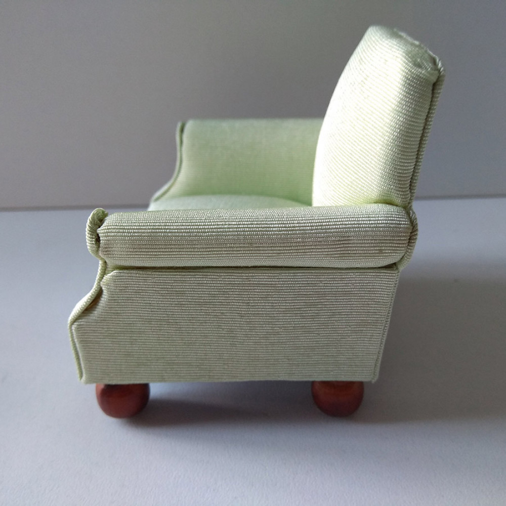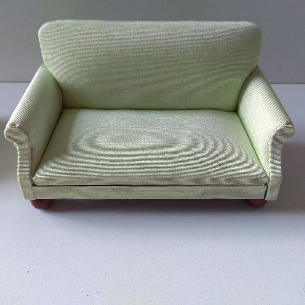Набор миниатюрной мебели для кукольной гостиной : двухместный диван, просторное кресло, столик и пуфик. Такая мебель подойдет для оформления современных интерьеров в кукольных домиках и румбоксов масштабом 1:12 (для куколок высотой около 12 см)