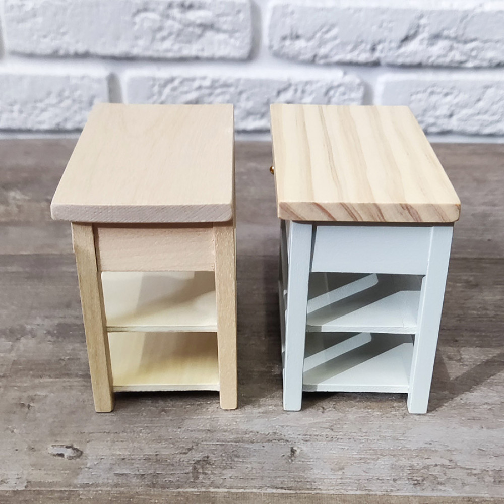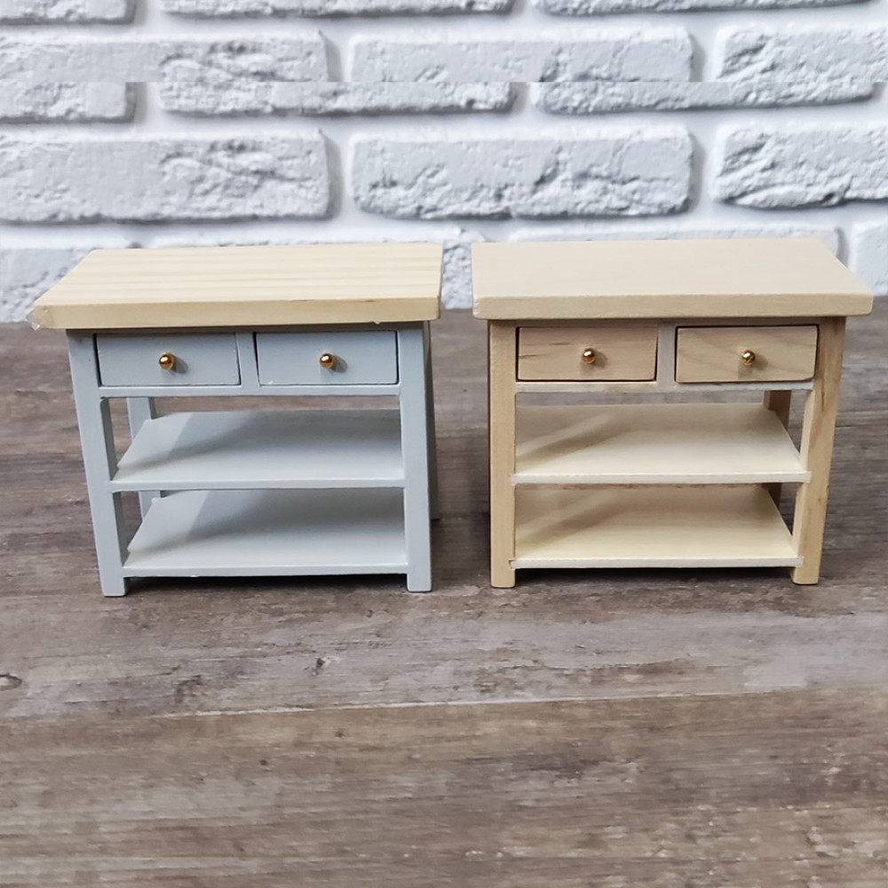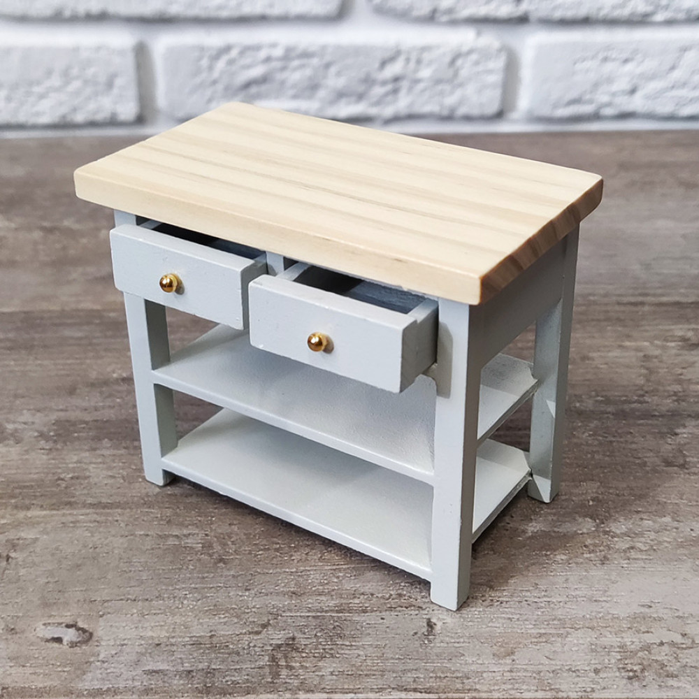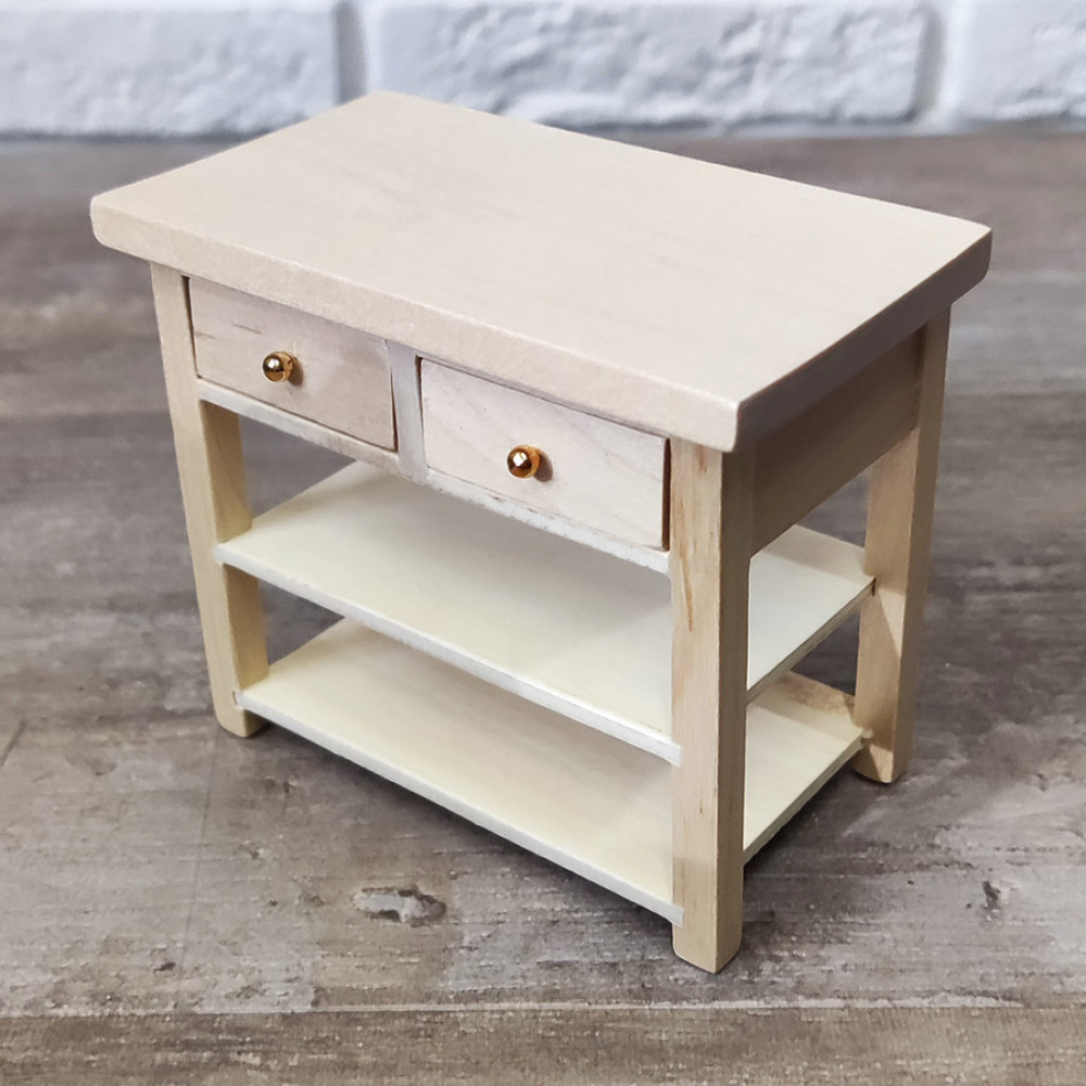 Аккуратный миниатюрный кухонный столик для кукол с двумя выдвигающимися ящичками и открытыми полками внизу. Такая кукольная мебель впишется в кухню, ванную комнату и другие кухонные помещения в домике или румбоксе.