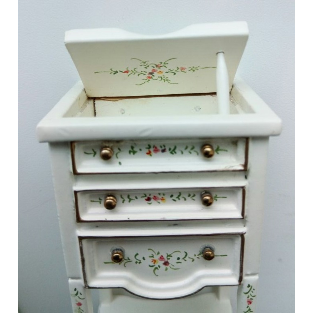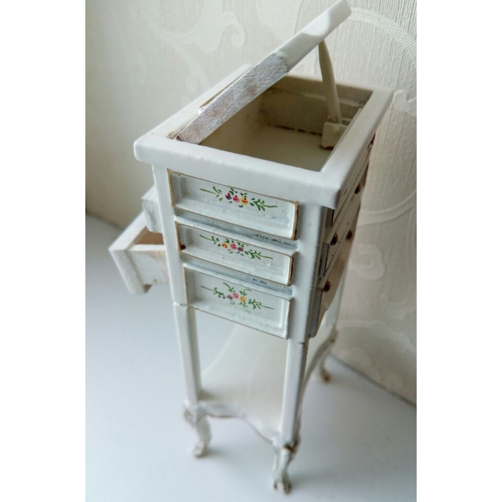 Бюро для кукол Золото и роспись на белом для оформления тематических румбоксов или кукольных домиков со стилизацей под рококо или дворцовый стиль. Миниатюрная мебель выполнена из дерева, окрашена в белый цвет с элементами золочения и тончайшей ручной росписью. Ящички выдвигаются, дверцы открываются.