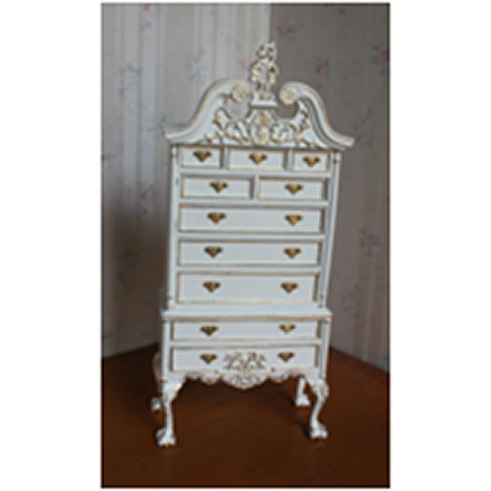 Миниатюрная мебель выполнена из дерева, окрашена в белый цвет с элементами золочения, украшена тонкой резьбой. Ящички выдвигаются, дверцы открываются.