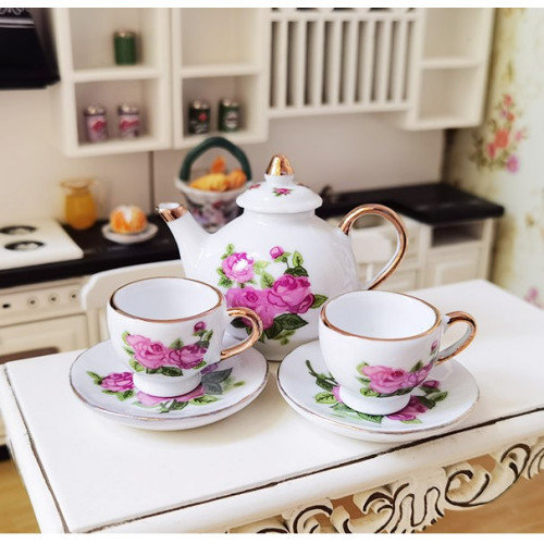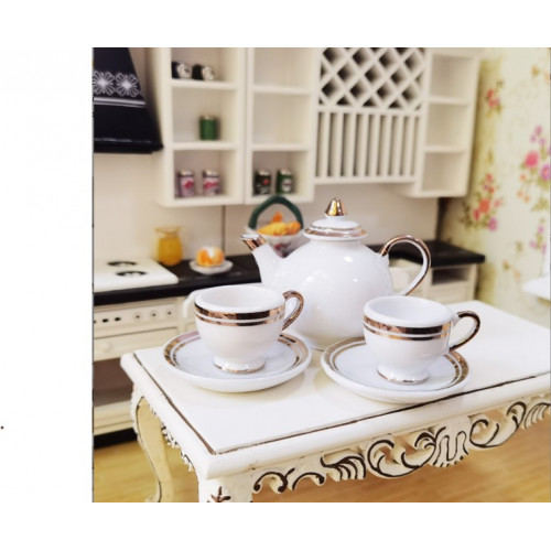 Миниатюрный чайный сервиз - две чайные пары и чайничек. Классическая расцветка - золото на белом. По..