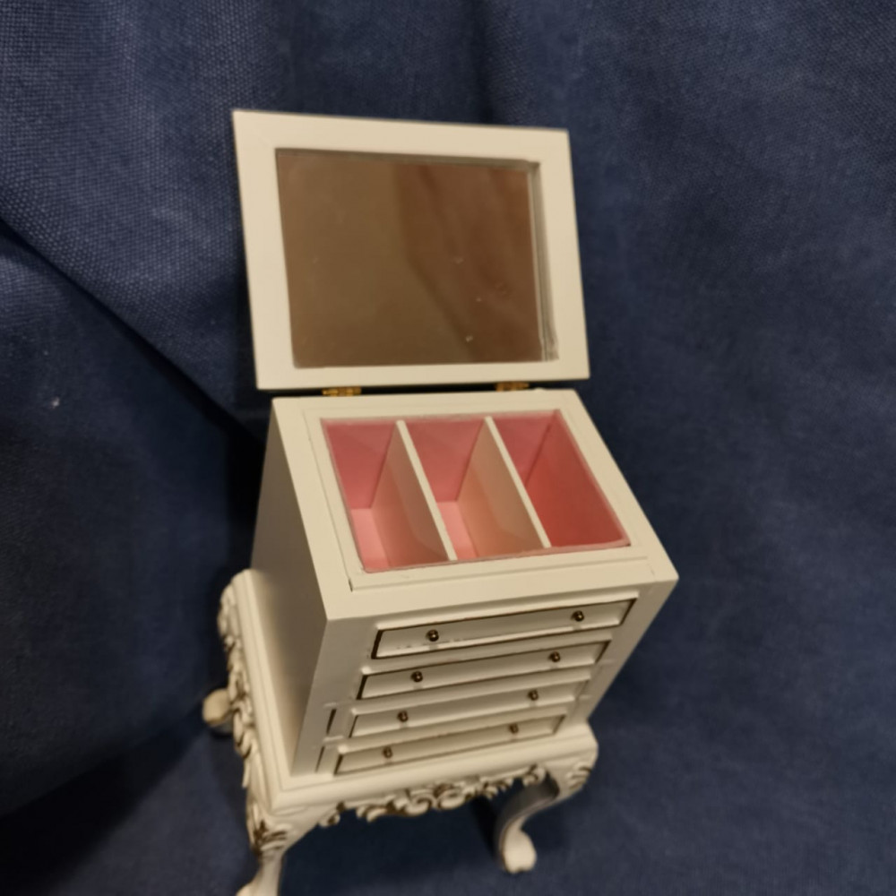 Миниатюрная тумбочка для хранения кукольных украшений в классическом стиле - ящички открываются, есть откидное зеркало, ящички выполнены с отсеками для украшений. Подойдет для кукольного дома в масштабе 1:6 (для кукол высотой около 24 см) или румбокса.