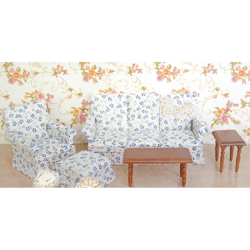 Дерево под орех, обивка тканевая в сине-голубой цветочек с коричневыми стебельками.