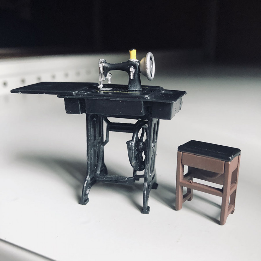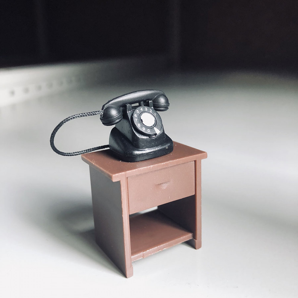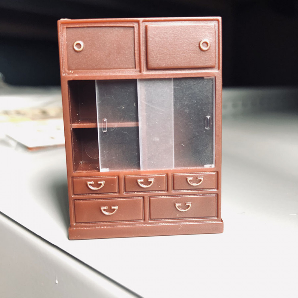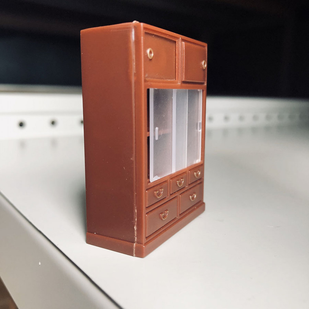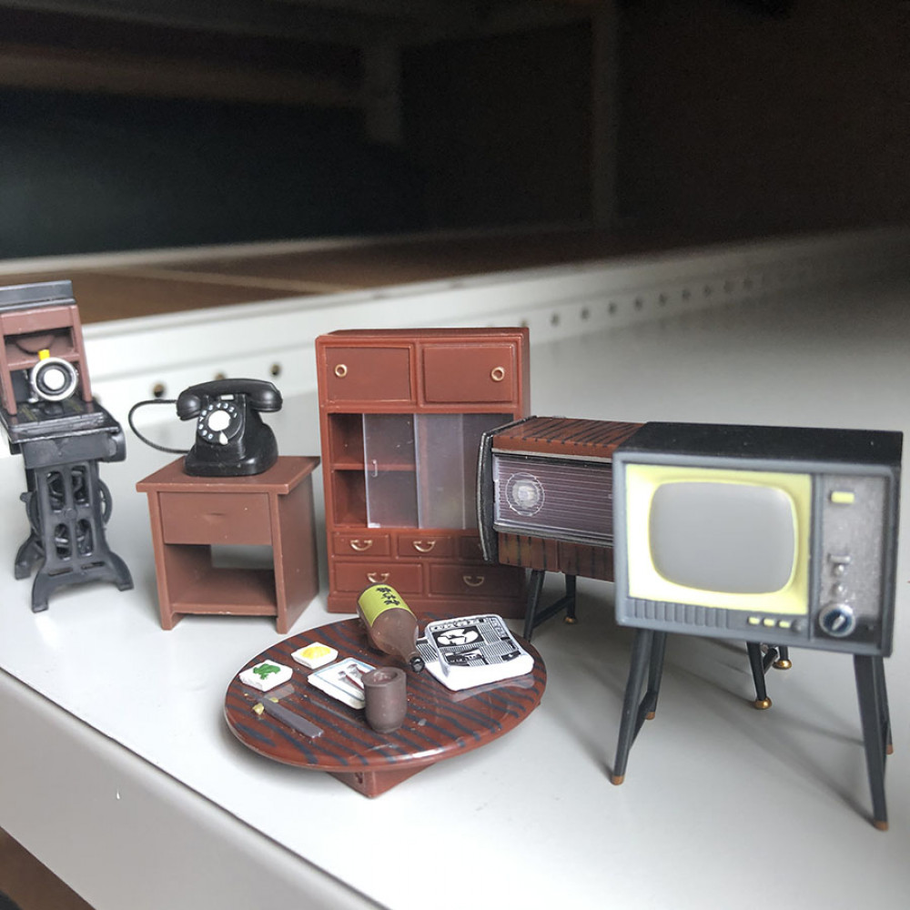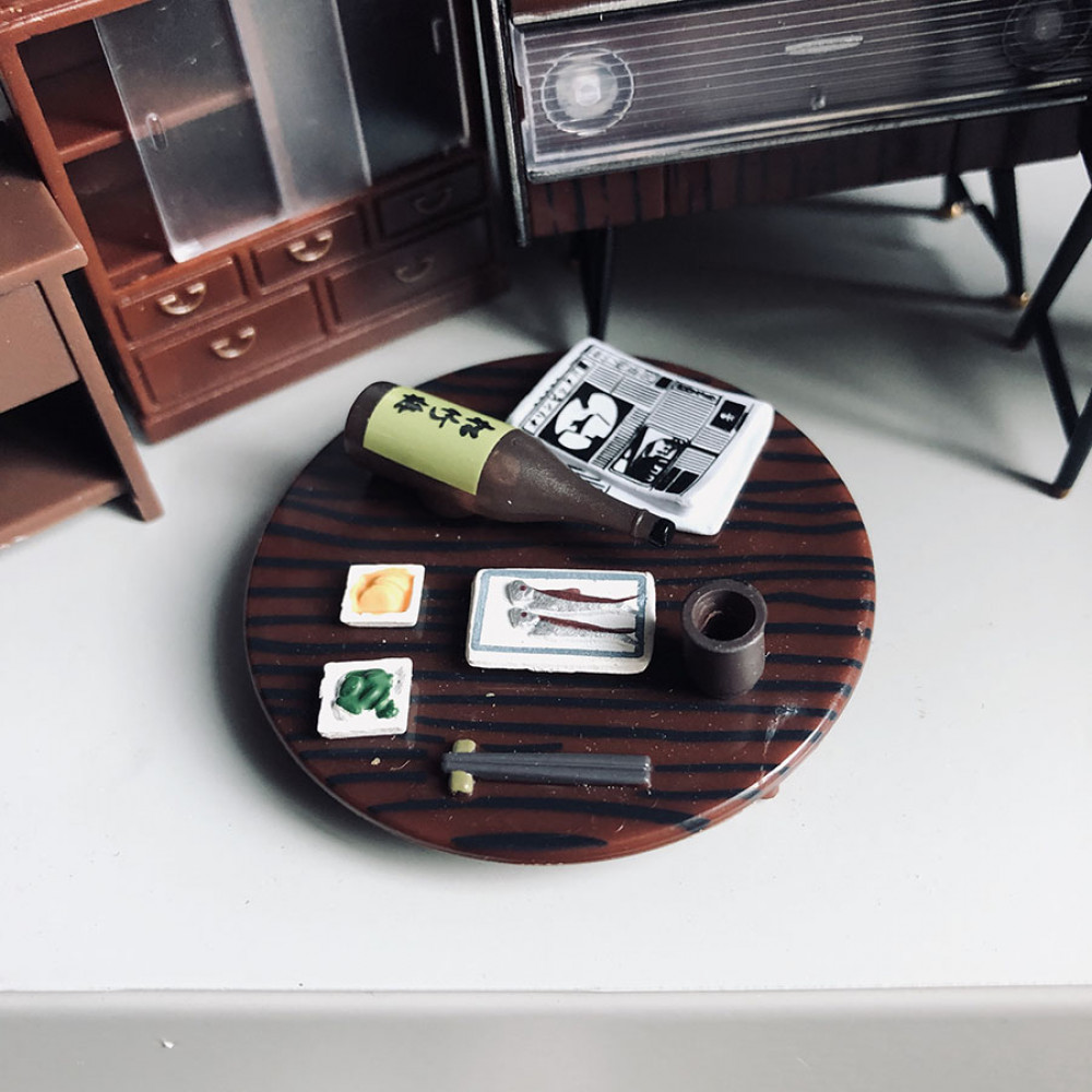 В набор входит шкафчик, круглый журнальный столик (диам. 4,5см) с набором суши, бутылочкой (2,5 м) саке и стаканчиком, телевизор на подставке (высота 4,3 см), тумбочка с телефоном, проигрыватель (длина 5,1 см), швейная машинка на подставке с табуреткой.