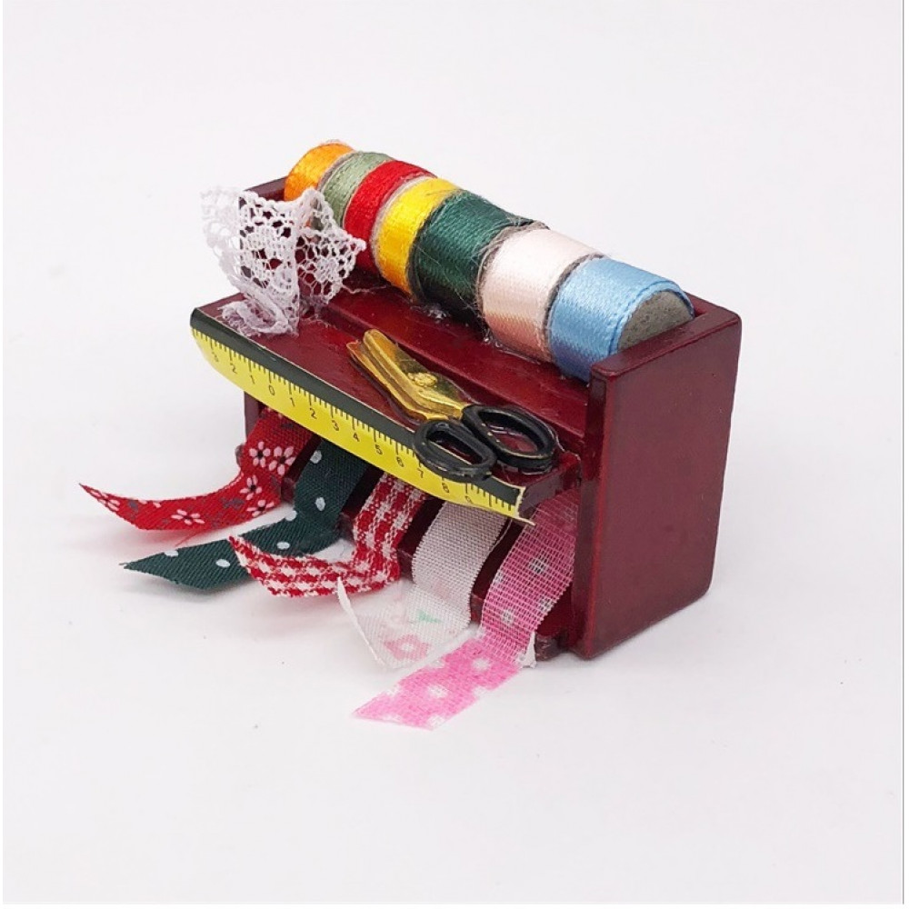 Миниатюрная шкатулка с лентами, сантиметром и ножницами для куклы-швеи. Такой предмет интерьера подойдет для оформления кукольного домика или румбокса масштабом 1:12 - для кукол около 12 см.