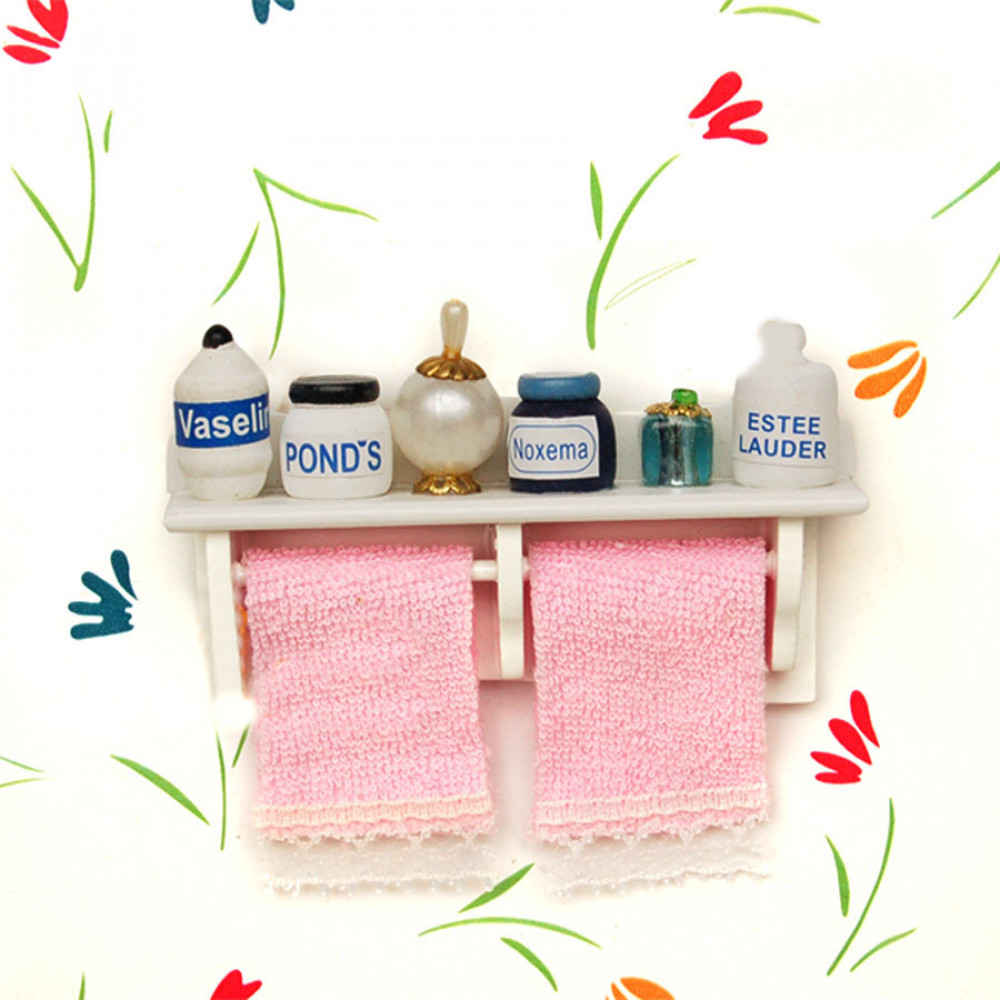 Полка для ванной комнаты с полотенцами и большим набором косметических средств - подойдет для кукольного домика или румбокса масштабом 1:12