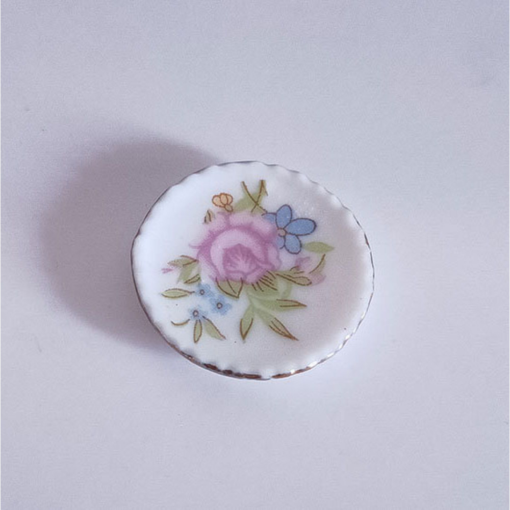 Фарфоровая тарелочка с изображением розы для кукольных домиков и румбоксов в масштабе 1:12