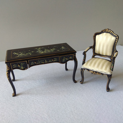 Миниатюрный письменный стол для кукол с выдвижными ящичкам и стул со светлой обивкой. Роспись с кита..