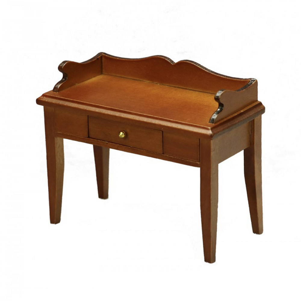 Стол письменный выполнен из дерева, цвет орех, имеет выдвижной ящик с золотой ручкой.