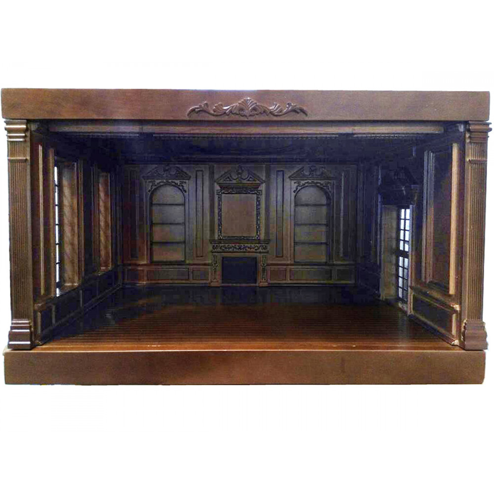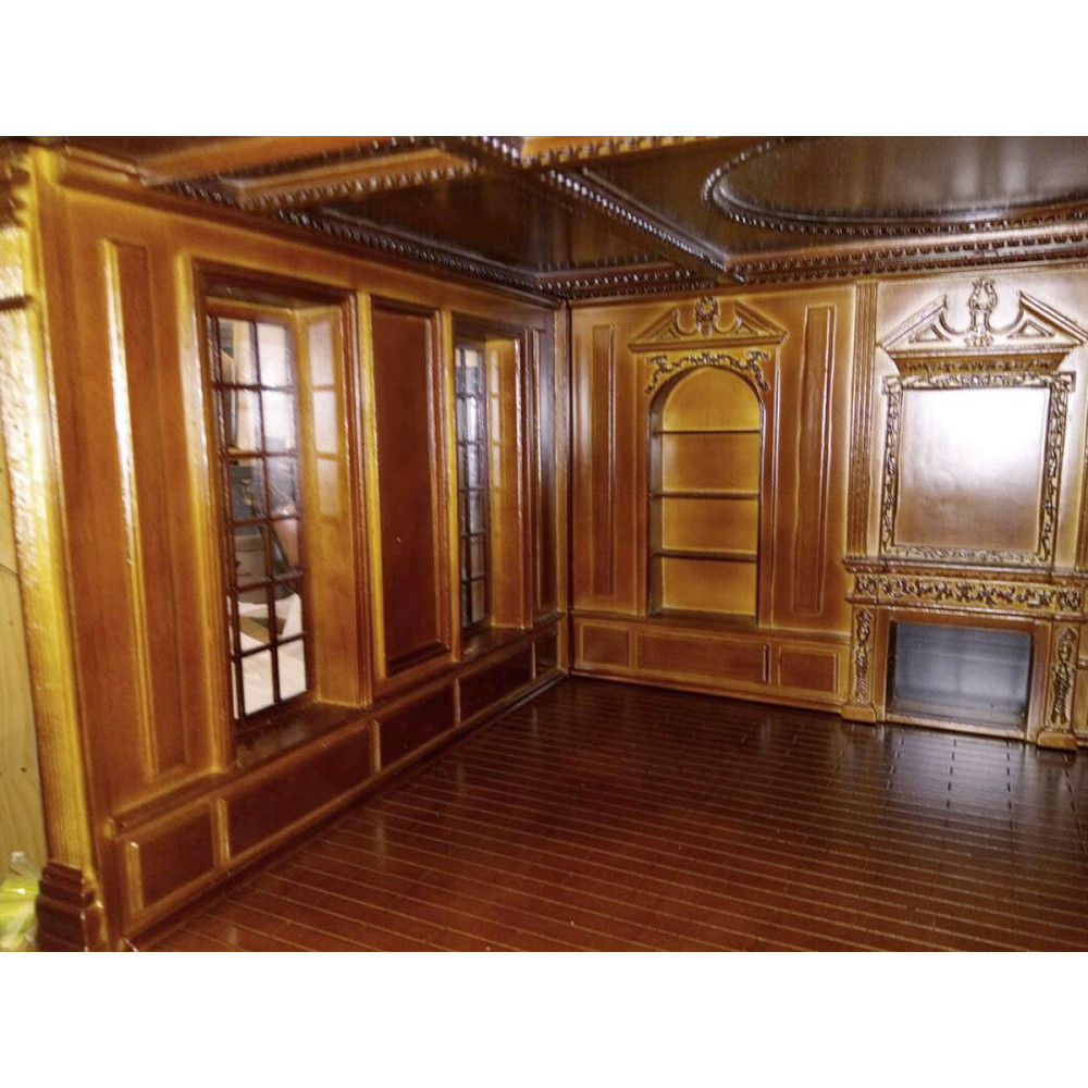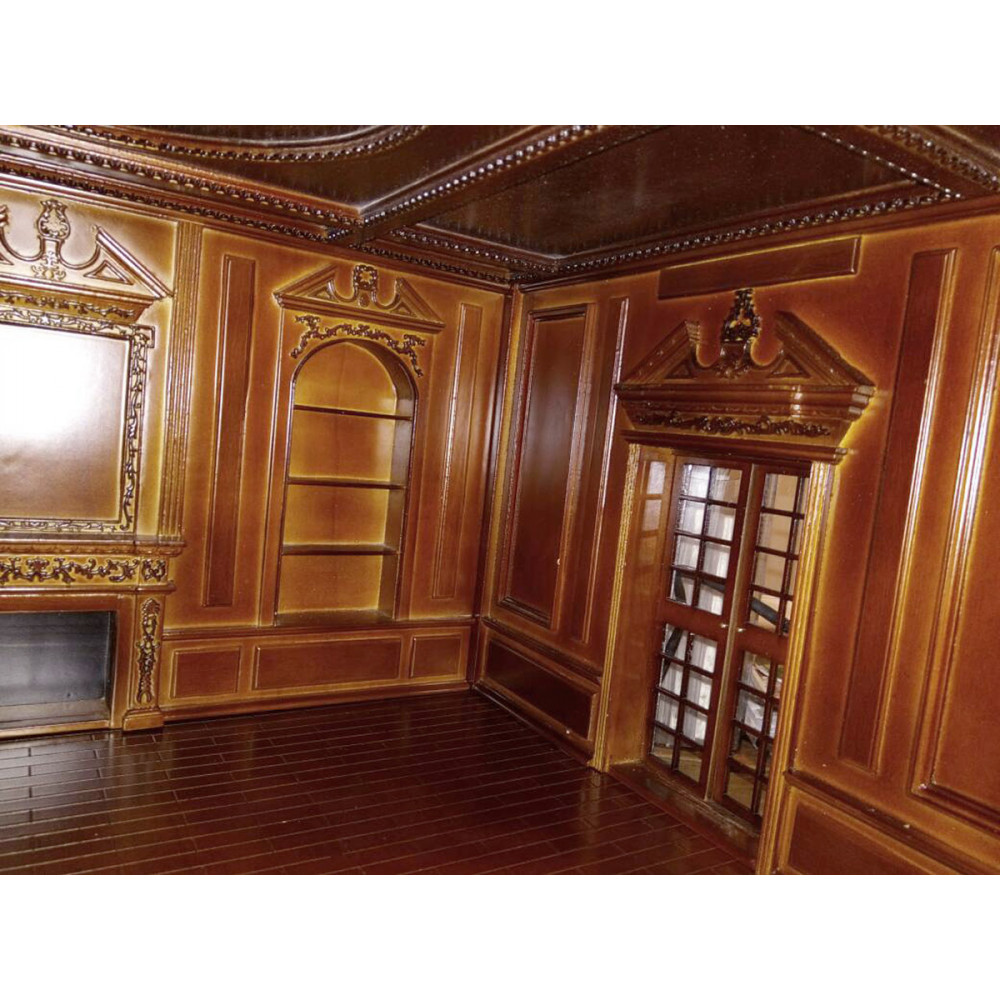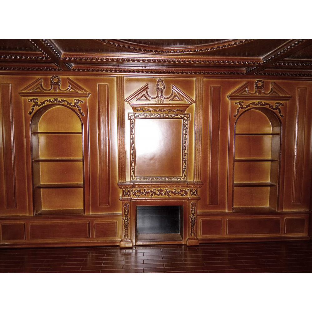 Центральная панель со встроенными полками и камином. Боковые панели: слева - с двумя застекленными окнами, справа – с застекленной входной дверью. Пол коричневый, глянцевый, с рифлением под паркет. Потолок также украшен резьбой.