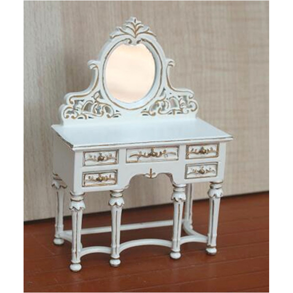 Изящный туалетный столик с круглым зеркалом, украшен резьбой и позолотой. Деревянная мебель ручной работы премиум класса для оформления кукольного дома или румбокса.
