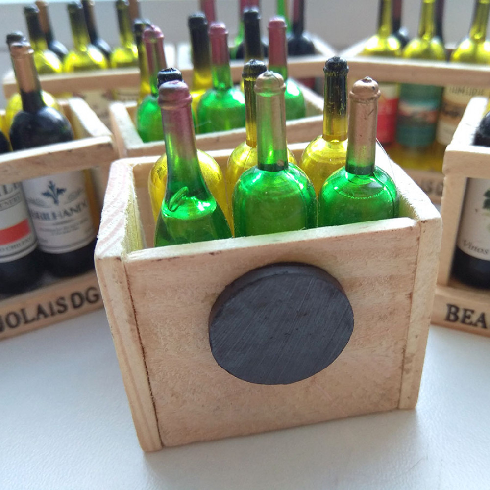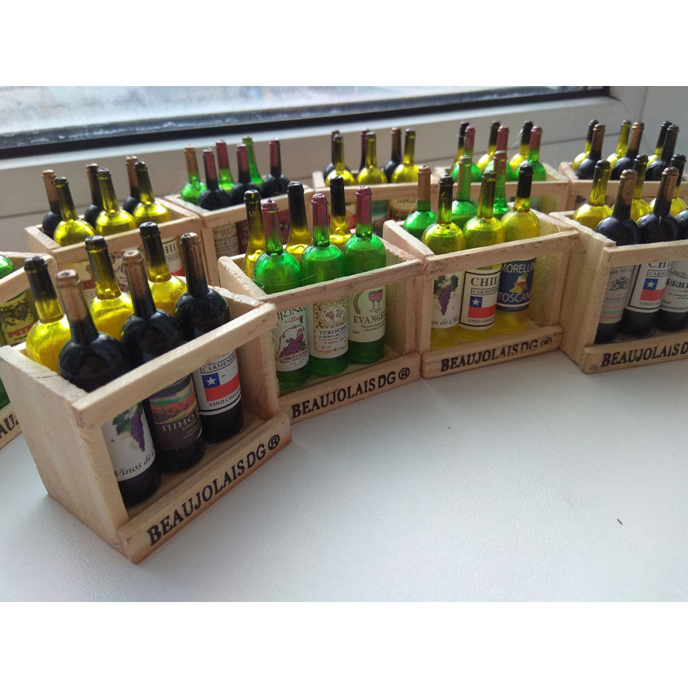 Миниатюрные бутылочки с вином в деревянном ящичке – для оформления тематического румбокса или кукольного домика в масштабе 1:12.