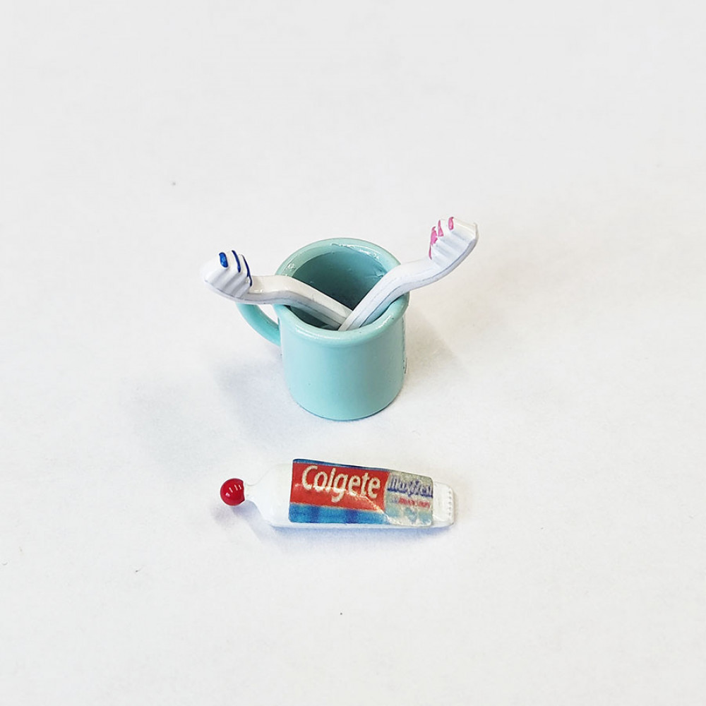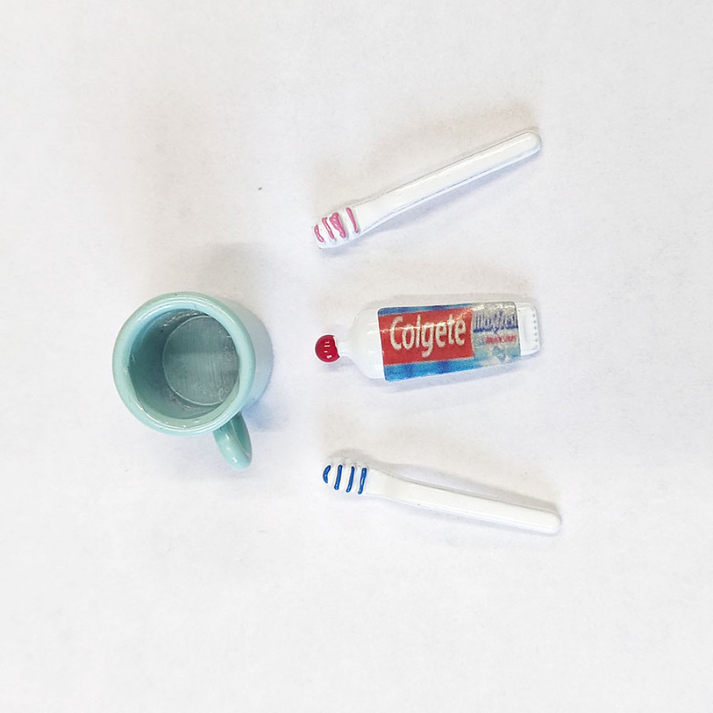 Миниатюрные принадлежности для чистки зубов - для кукольной ванной или туалетной комнаты (зубная паста, щетки и кружечка)