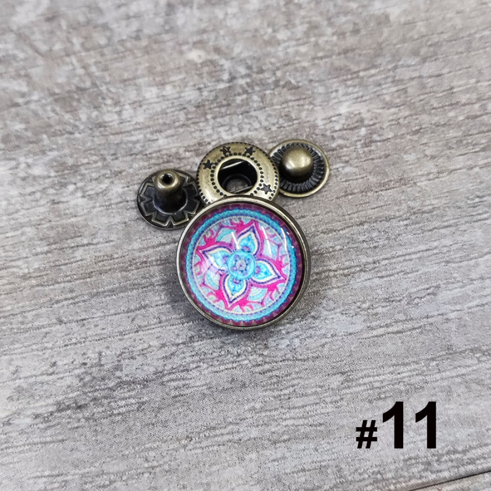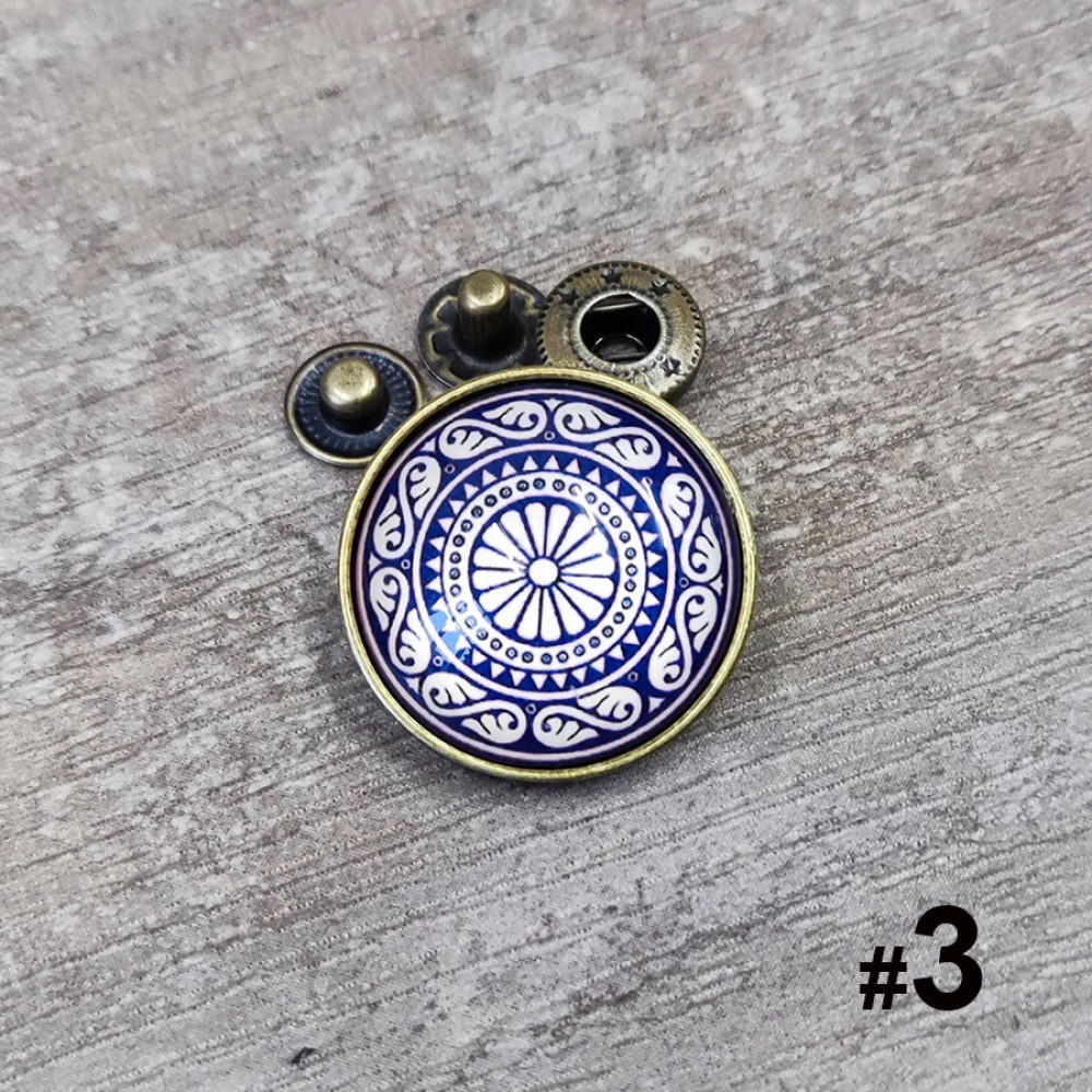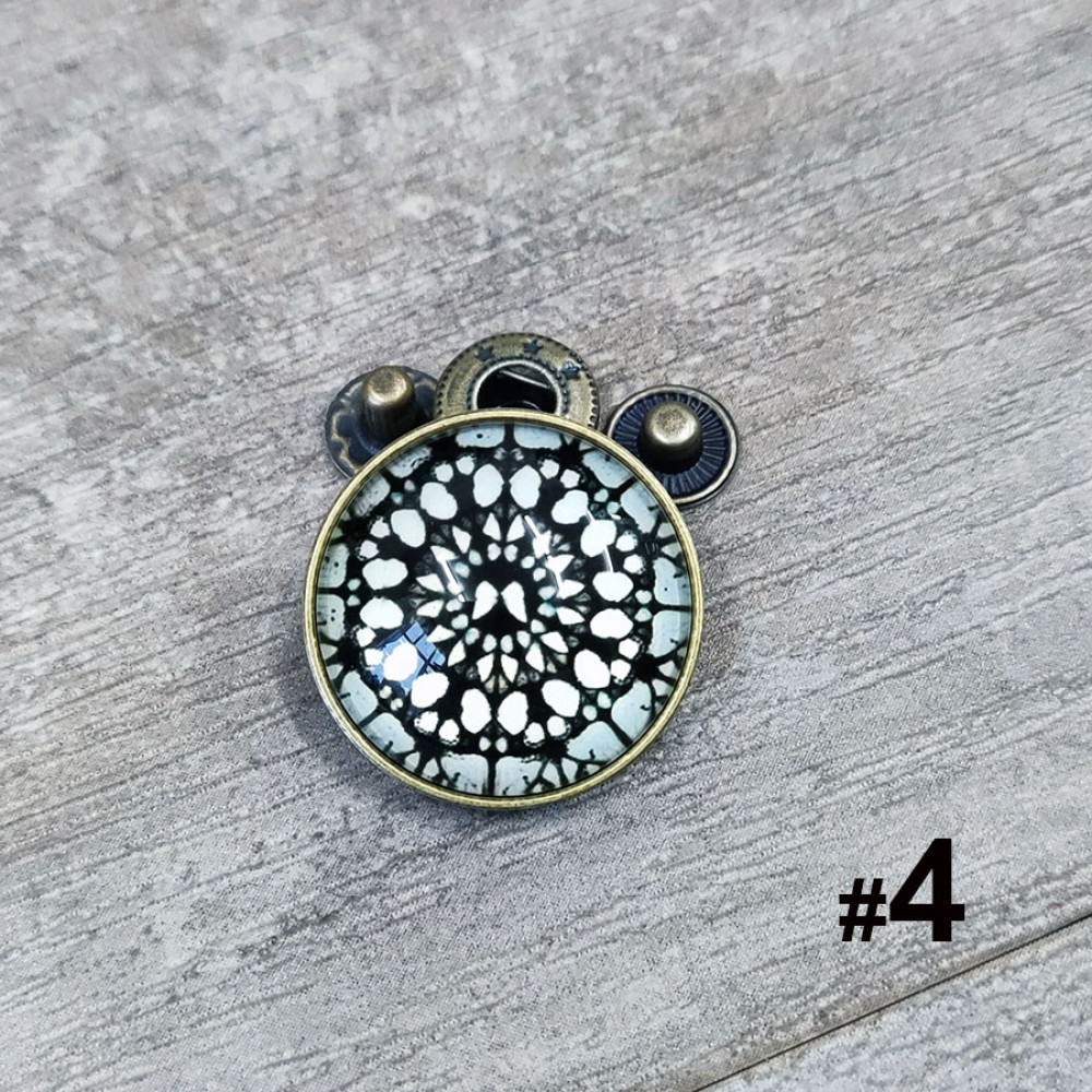 Кнопки пробивные с круглой шляпкой с узором, закрытом прозрачной смолой. Размеры декоративной шляпки 18 мм и 26 мм, остальные детали - кнопка Альфа №633 (12 мм).