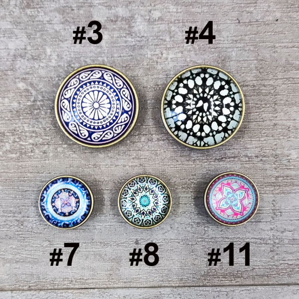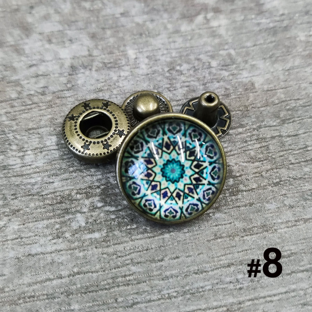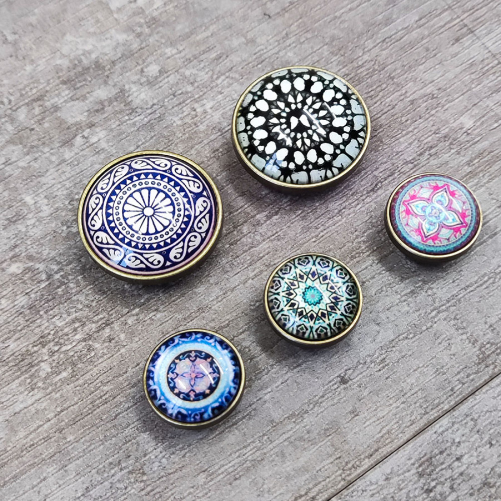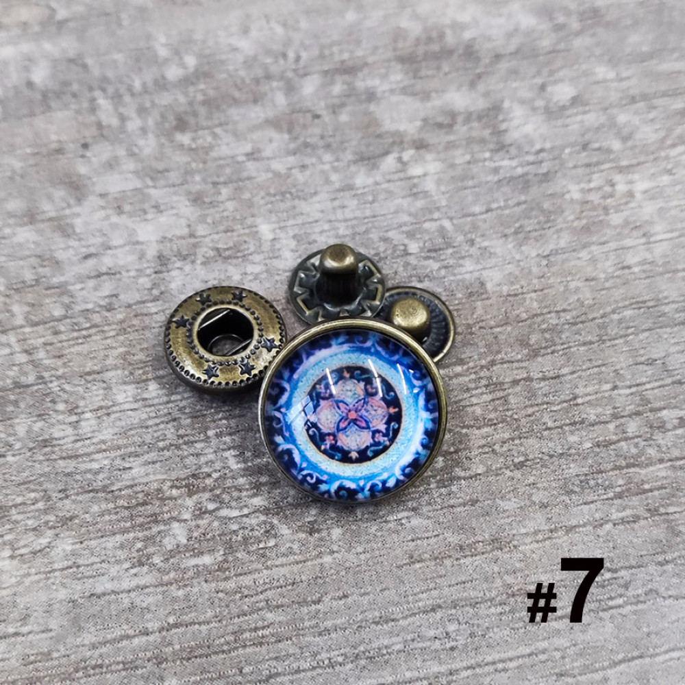 Кнопки пробивные с круглой шляпкой с узором, закрытом прозрачной смолой. Размеры декоративной шляпки 18 мм и 26 мм, остальные детали - кнопка Альфа №633 (12 мм).