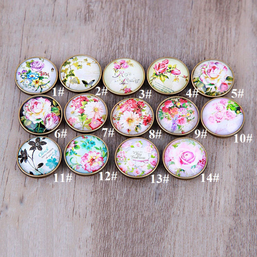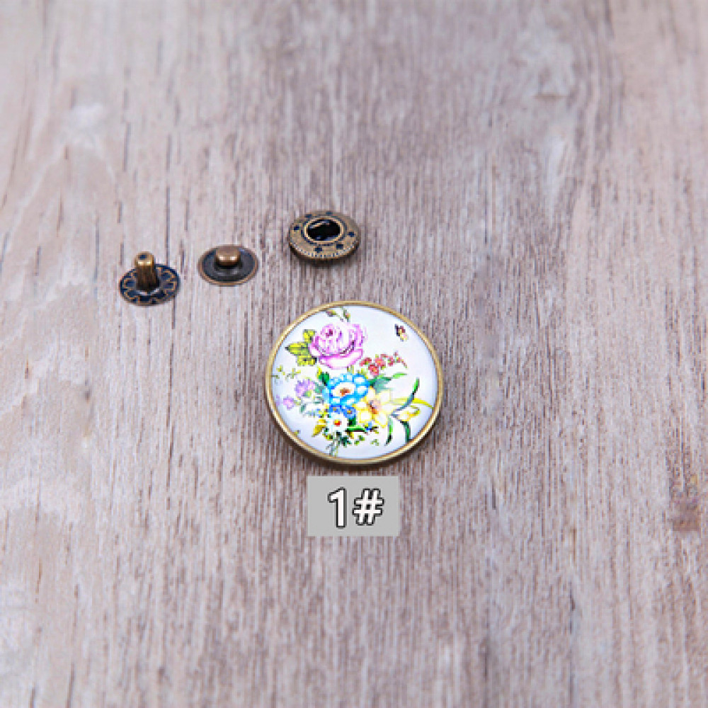 Кнопки пробивные с круглой шляпкой с цветочным узором, закрытом прозрачной смолой. Размеры декоративной шляпки 18 мм, остальные детали - кнопка Альфа №633 (12 мм).