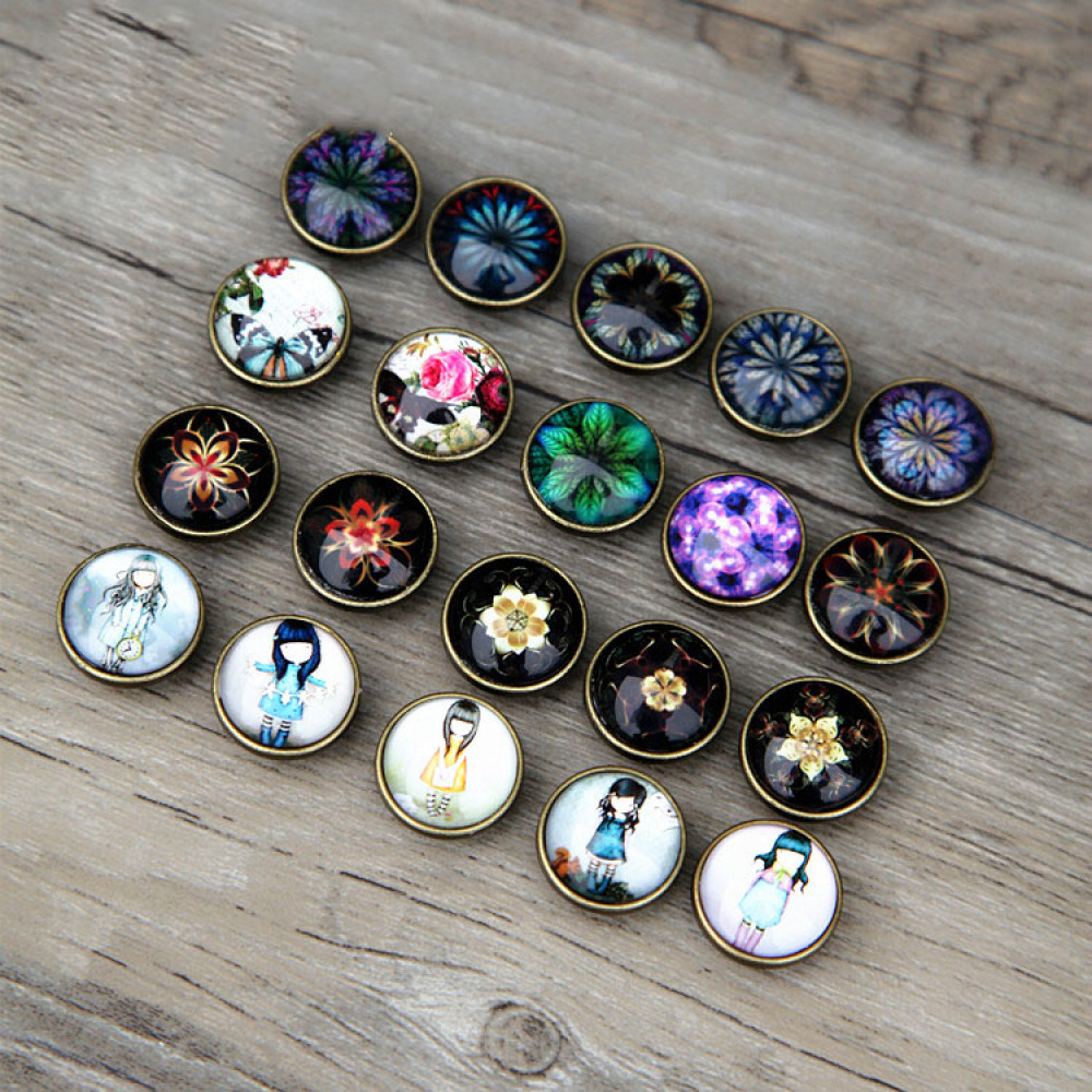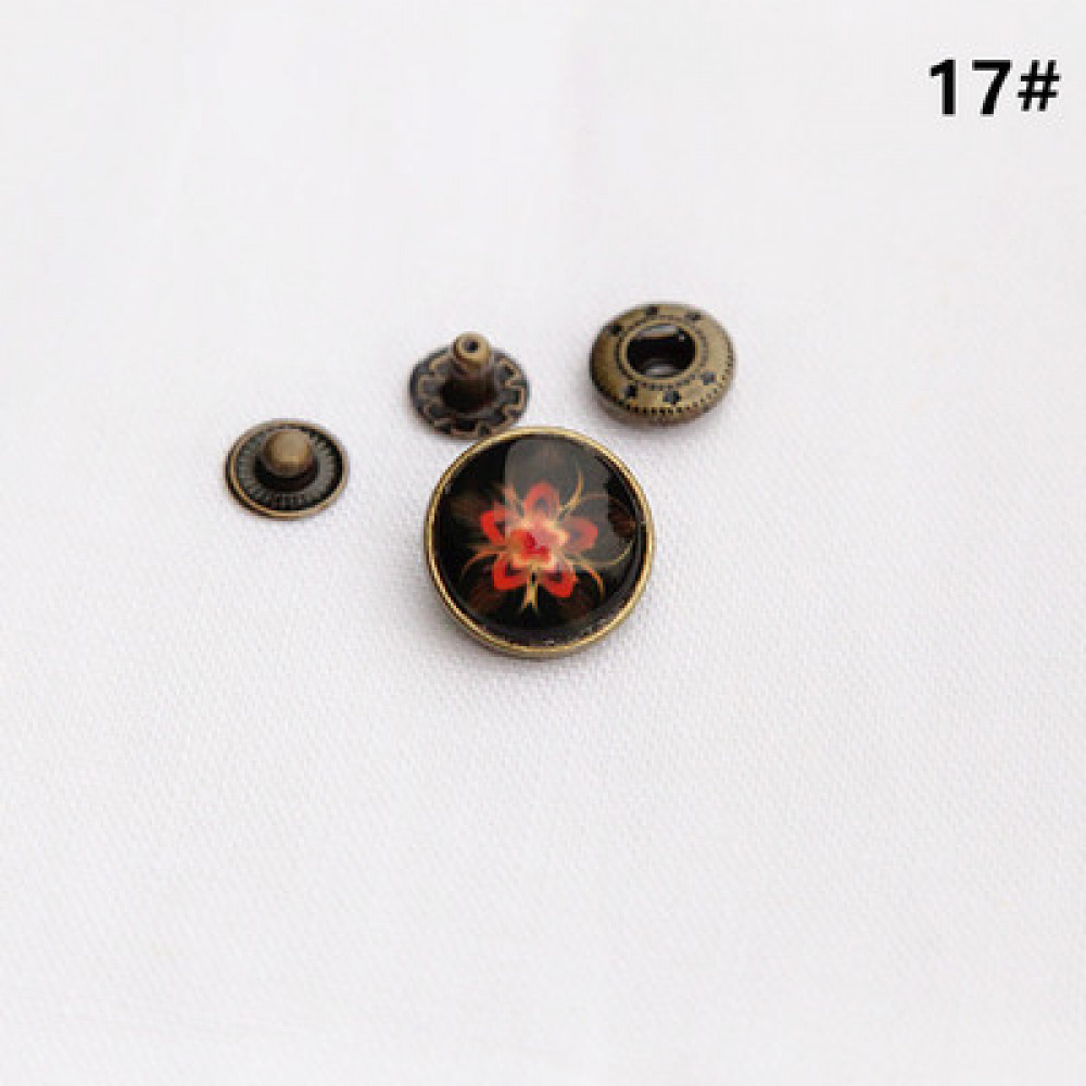 Кнопки пробивные с круглой шляпкой с узором, закрытом прозрачной смолой. Размеры декоративной шляпки 18 мм, остальные детали - кнопка Альфа №633 (12 мм).