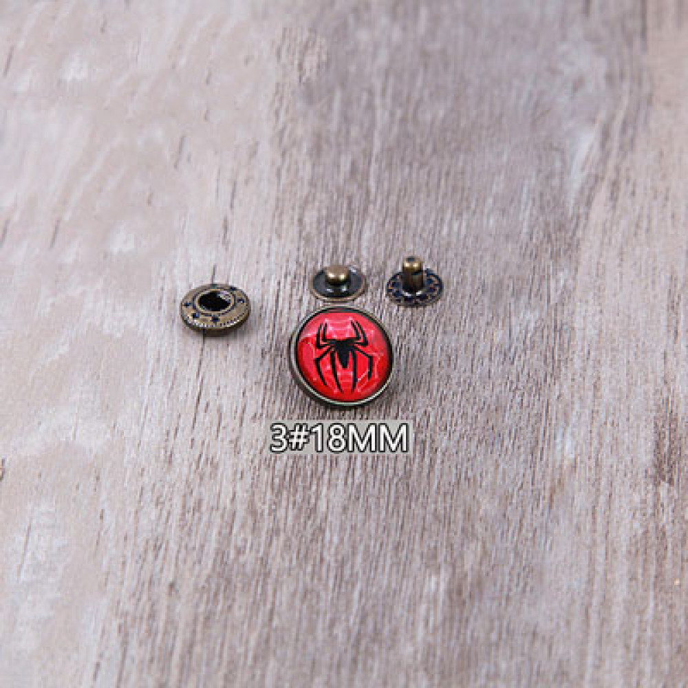 Кнопки пробивные с круглой шляпкой с узором, закрытом прозрачной смолой. Размеры декоративной шляпки 18 мм, остальные детали - кнопка Альфа №633 (12 мм).
