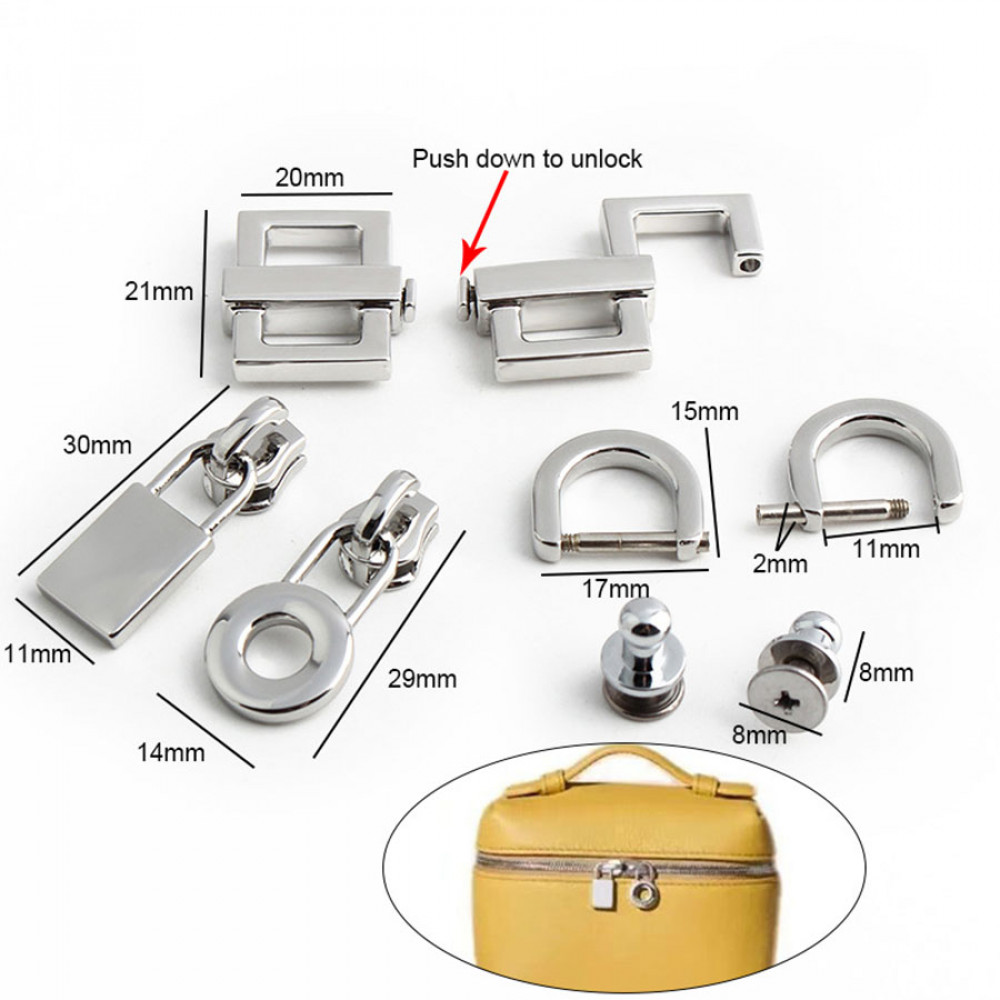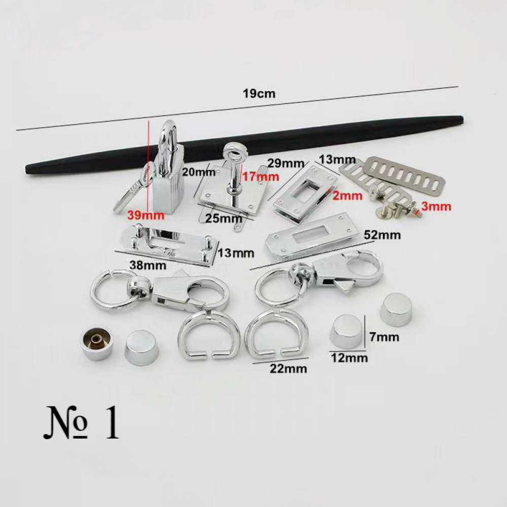 Помимо самой сборной конструкции замка для сумки в комплект входит всю необходимая фурнитура, включая навесной замочек с ключом, 1 уплотнитель-вставку для ручки, 2 карабина , 2 полукольца D-образные двойные, 4 пукли.