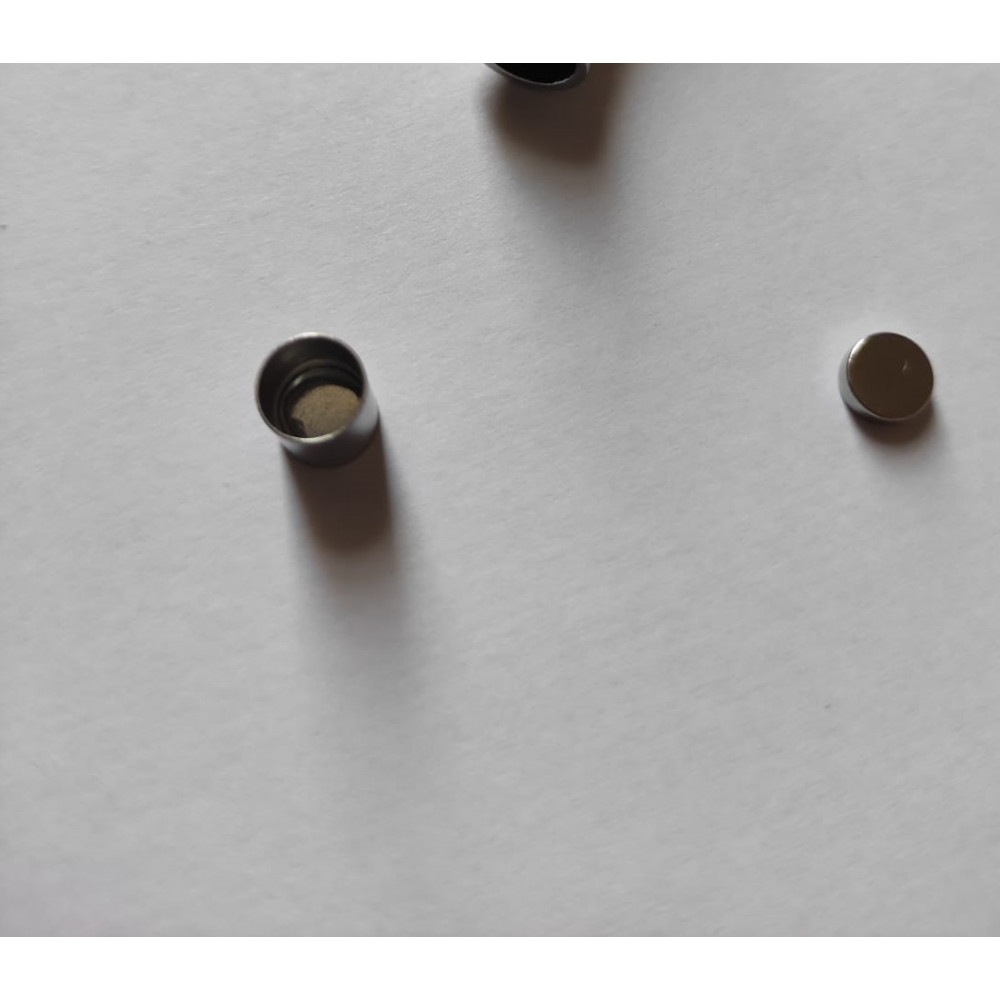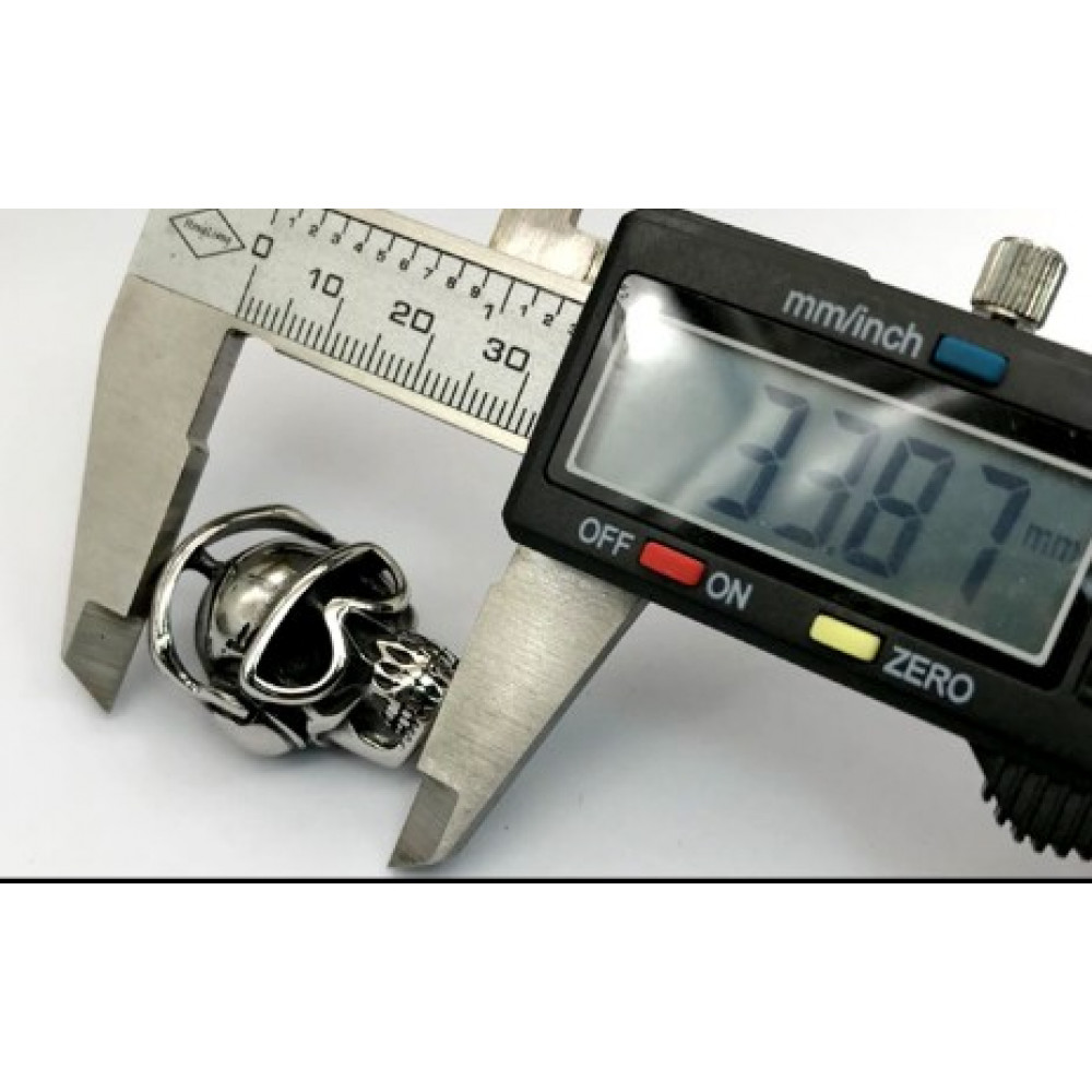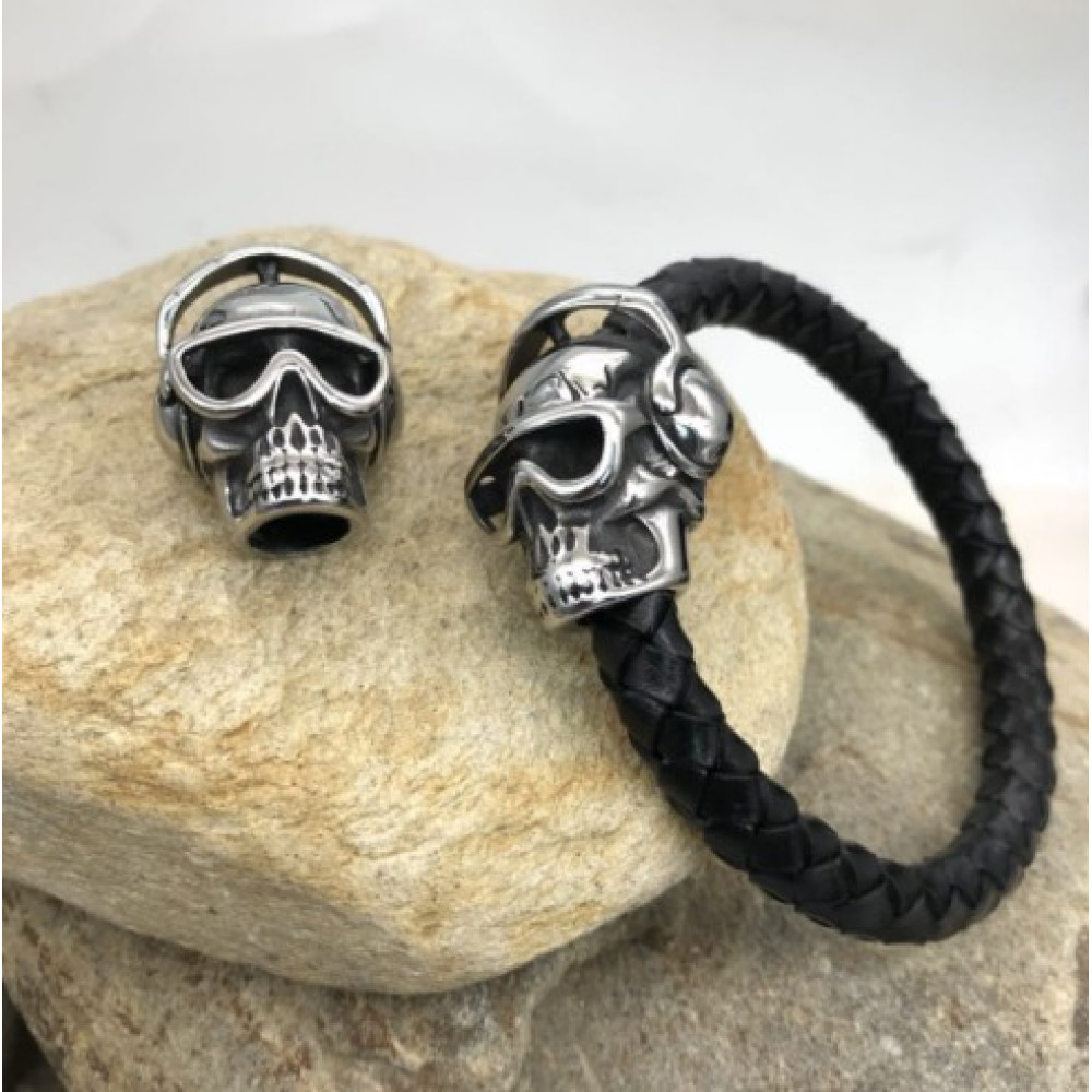 Застежка для браслета в виде черепа в наушниках и очках на шнур круглого сечения диаметром около 8 мм, внешний размер - 19х33 мм. С одной стороны в застежке есть отверстие для вклеивания шнура, с другой стороны отверстие для второго конца шнура имеет магнит, конец шнура оформляется в магнитную "заглушку" цилиндрической формы (данная деталь входит в комплект).