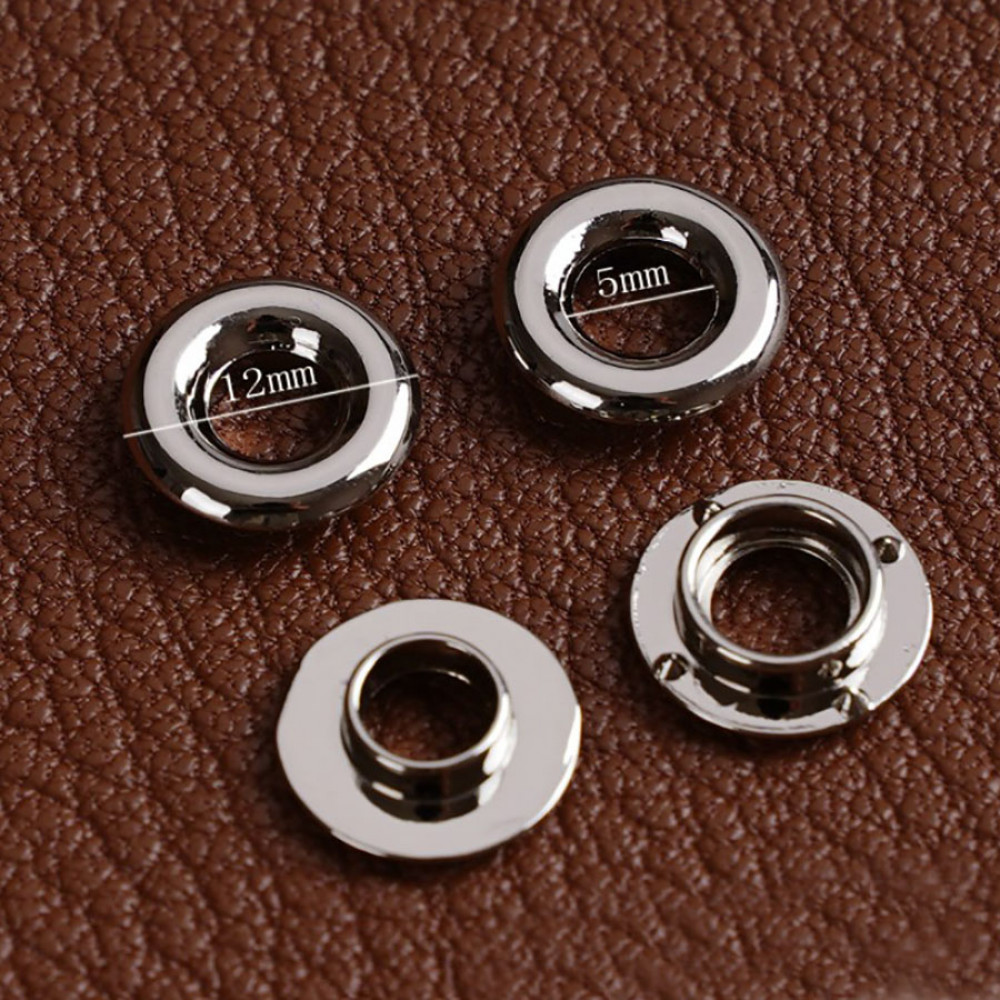 Стальные люверсы с отверстием 5 мм красивой формы, напоминающей бублик. Данная модель отличается простотой в установке - необходимо проделать отверстие пробойником, а сами детали защелкиваются (зажимаются).