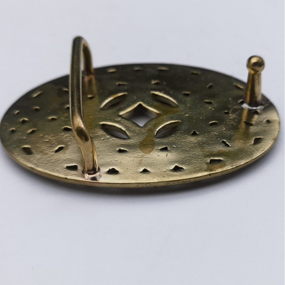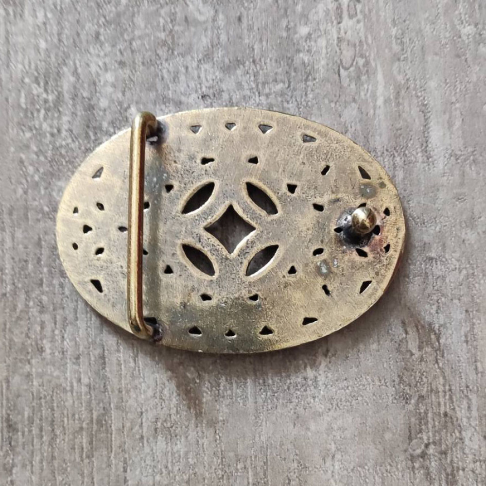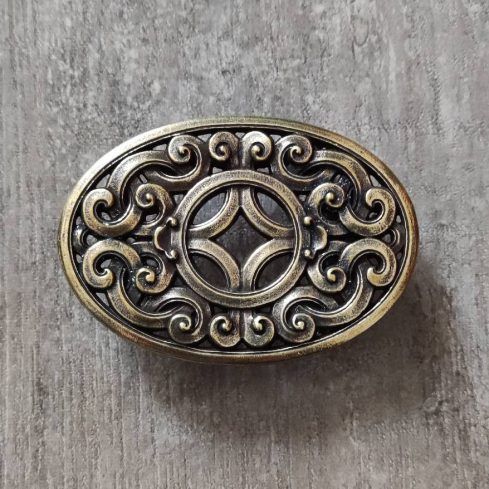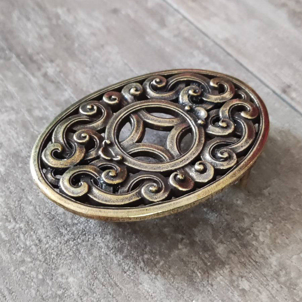 Качественная латунная пряжка для ремня. Простая овальная форма, с затейливым узором.
