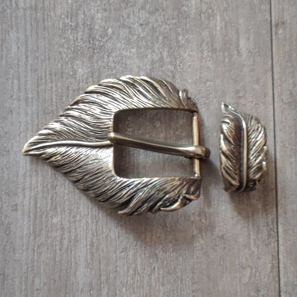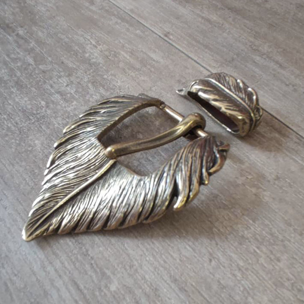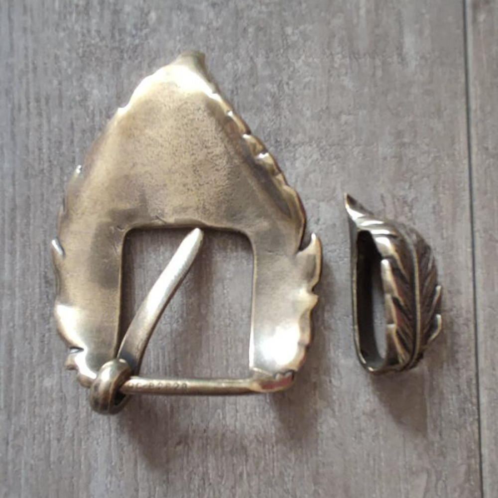 Качественная латунная пряжка для ремня в форме рельефного листа, в комплекте со шлевкой в виде листика.