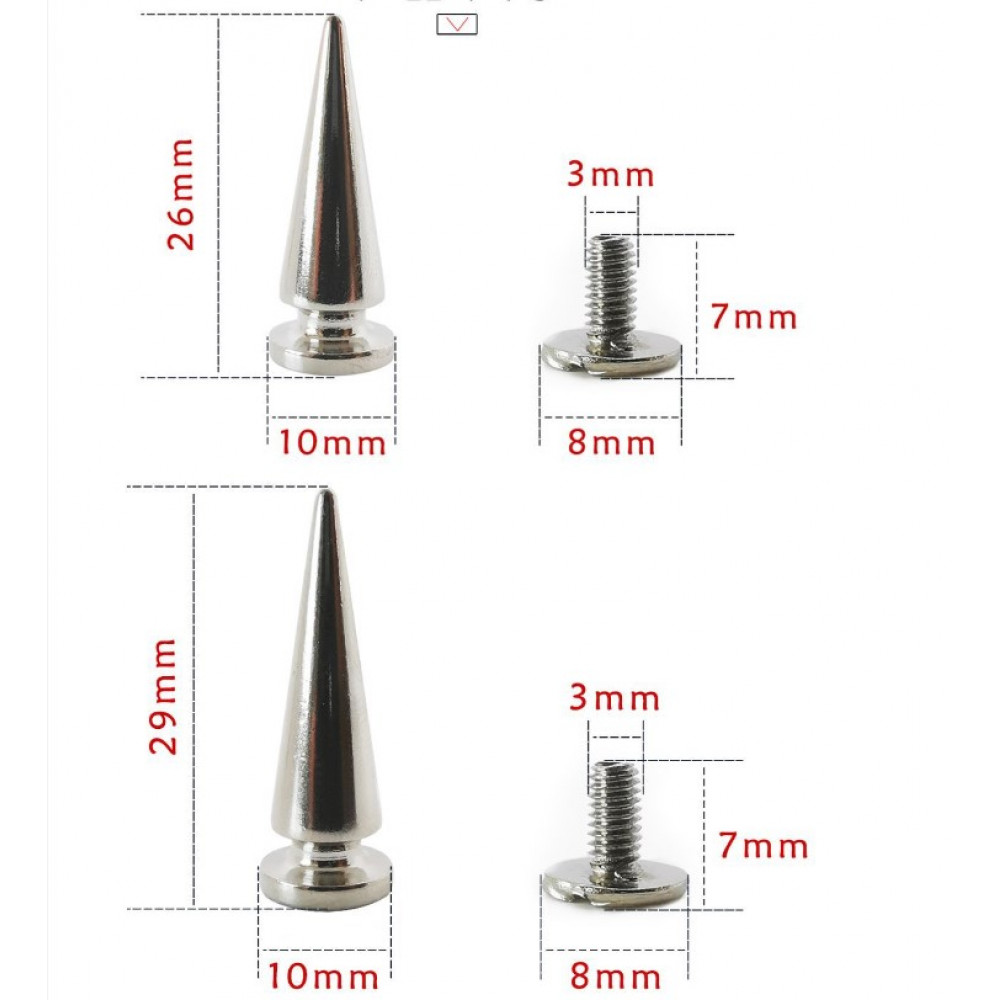 Декоративные винтовые шипы используются при изготовлении ремней, браслетов, собачьих ошейников, сумок и других изделий из кожи. Шипы на винтах используются также при декоре одежды и обуви, они органично смотрятся на исторических костюмах или одежде рок и панк стиля. Творческий человек непременно найдет как использовать этот интересный оригинальный элемент декора