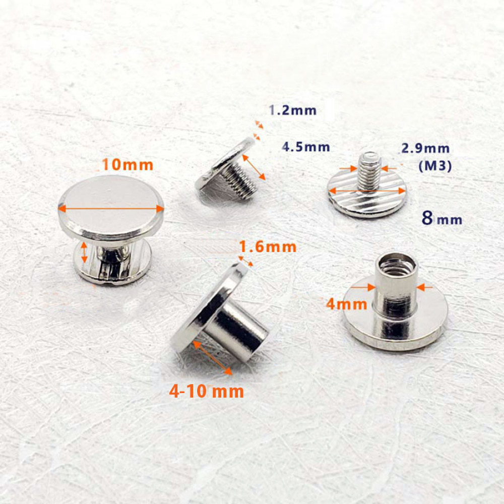 В комплект входит "кнопка" - диаметр шляпки 10 мм и винт для крепления - 8 мм.